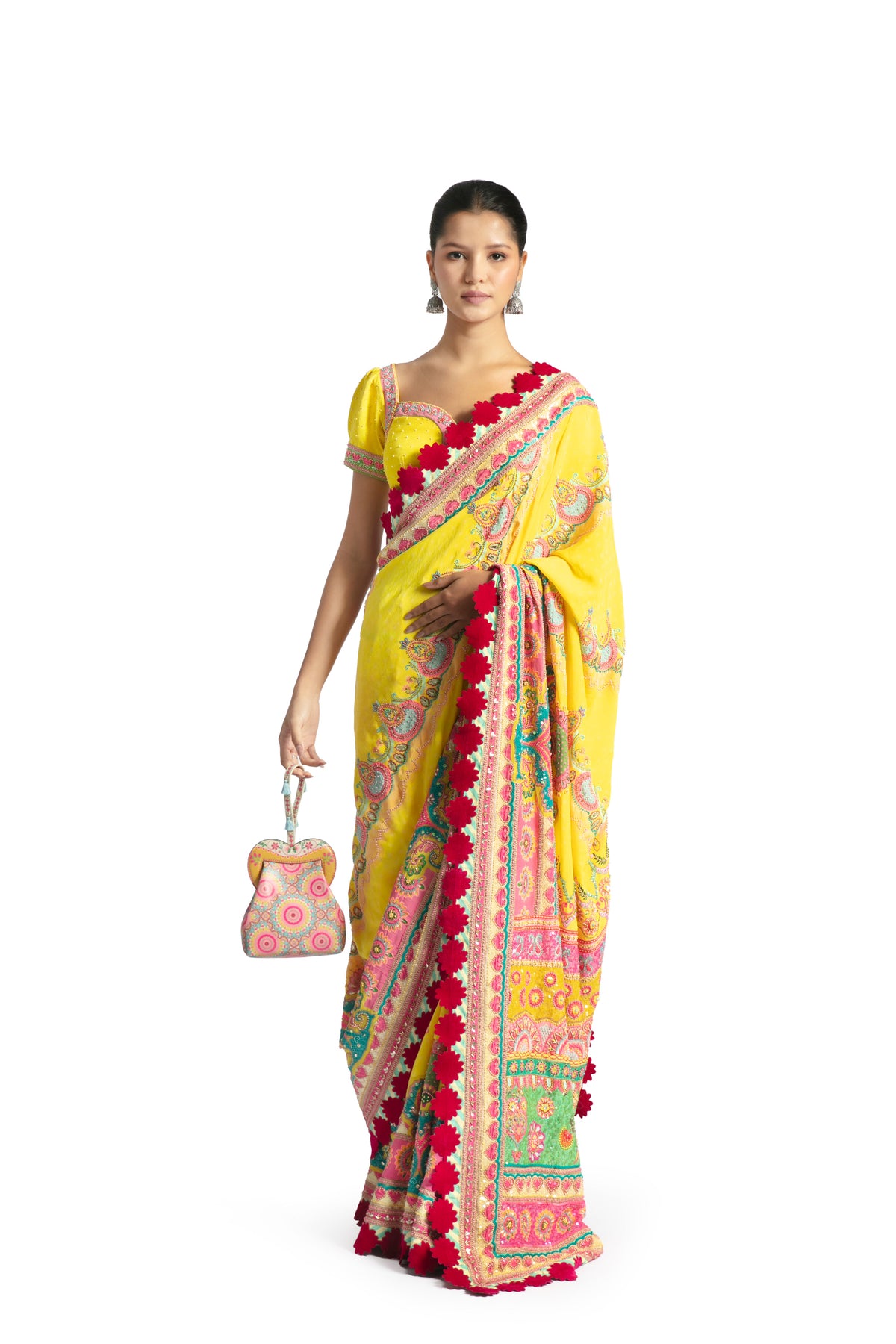 Blue Kaleidoscopic Studded Circular Hand Bag With Strap - The Trendiest Shape In The Handbag World Continues To Be A Favourite! The Simplest Way To Update Any Outfit Would Be To Sling Across This Handbag. The Bag Has A Detachable And Adjustable Shoulder Sling Strap. The Signature Style Siddhartha Bansal Prints Combined With Signature Style Avocadoe Riveting And Pom Pom Tassels Add An Instant Pop To Your Life!