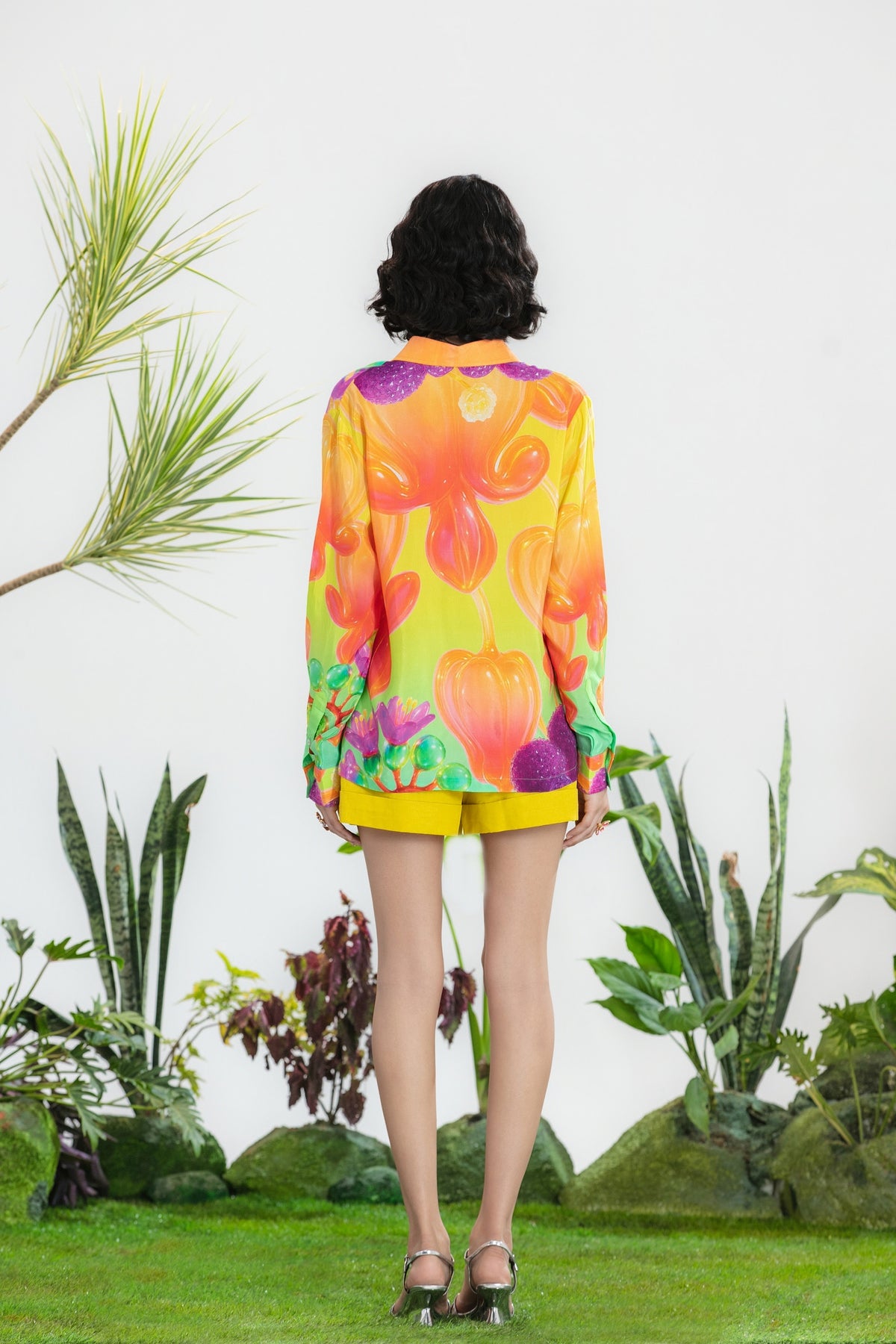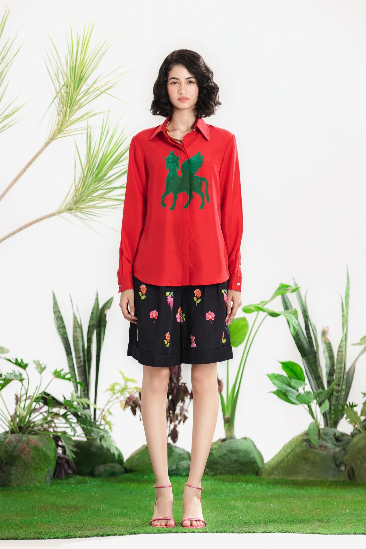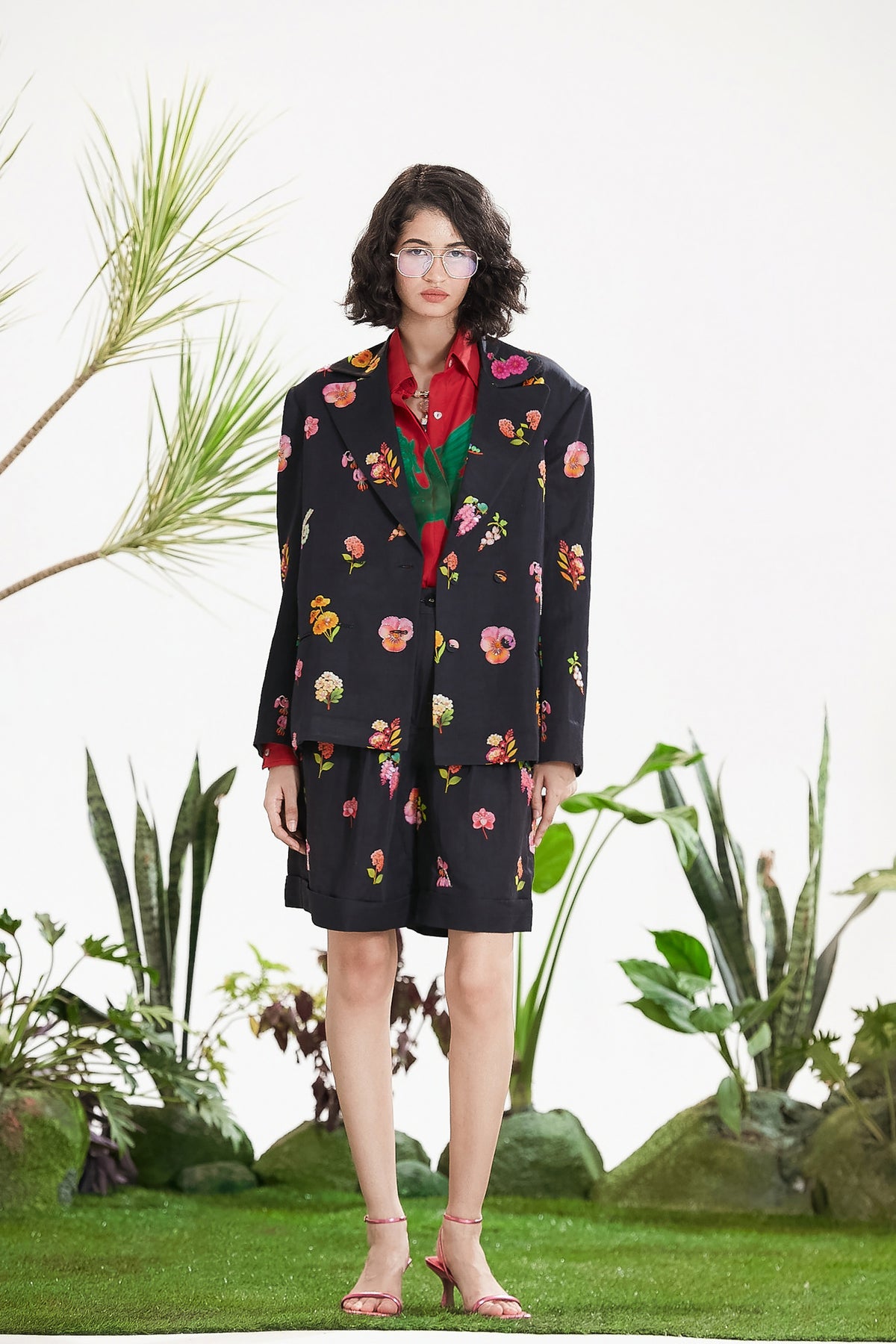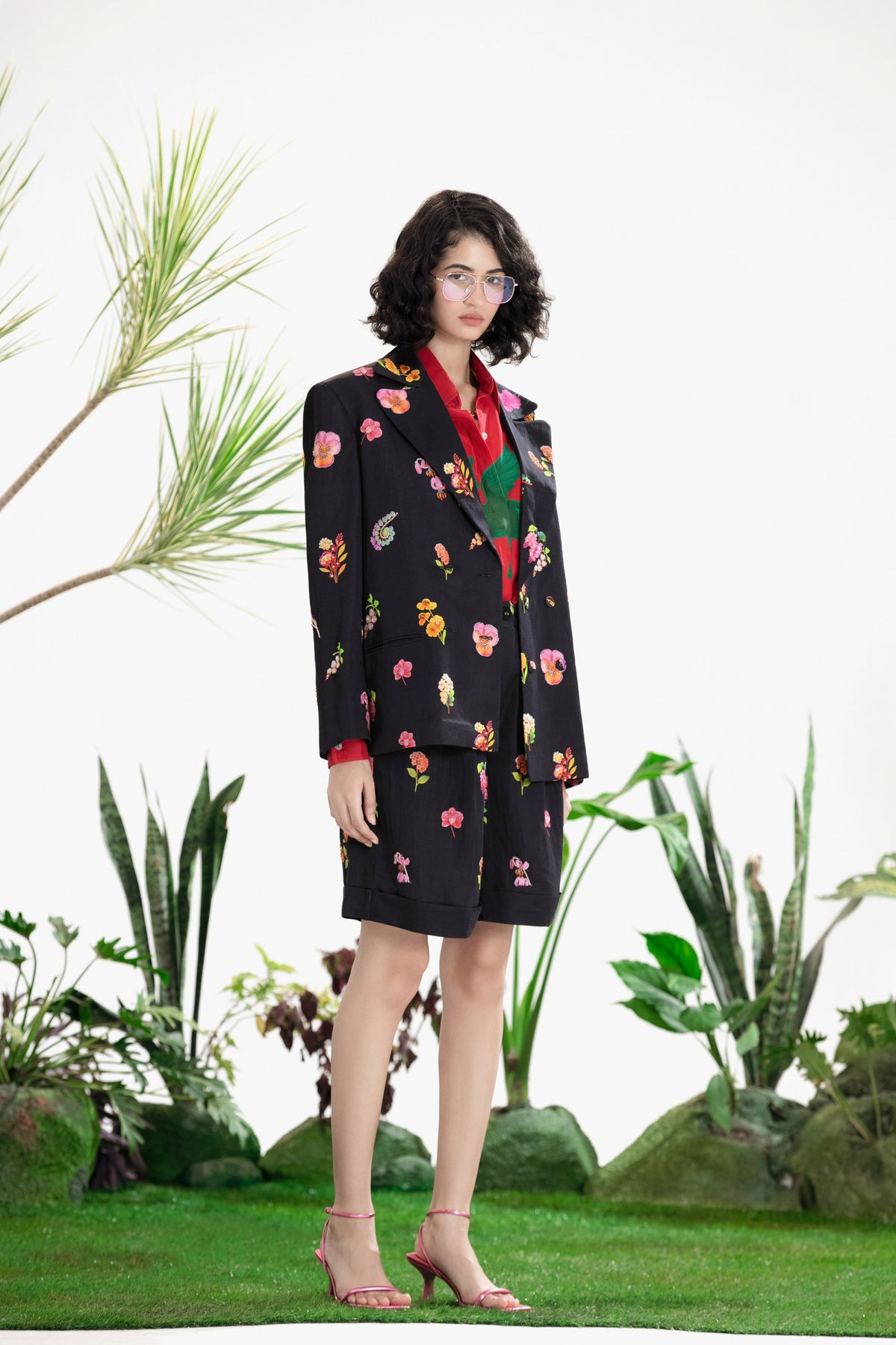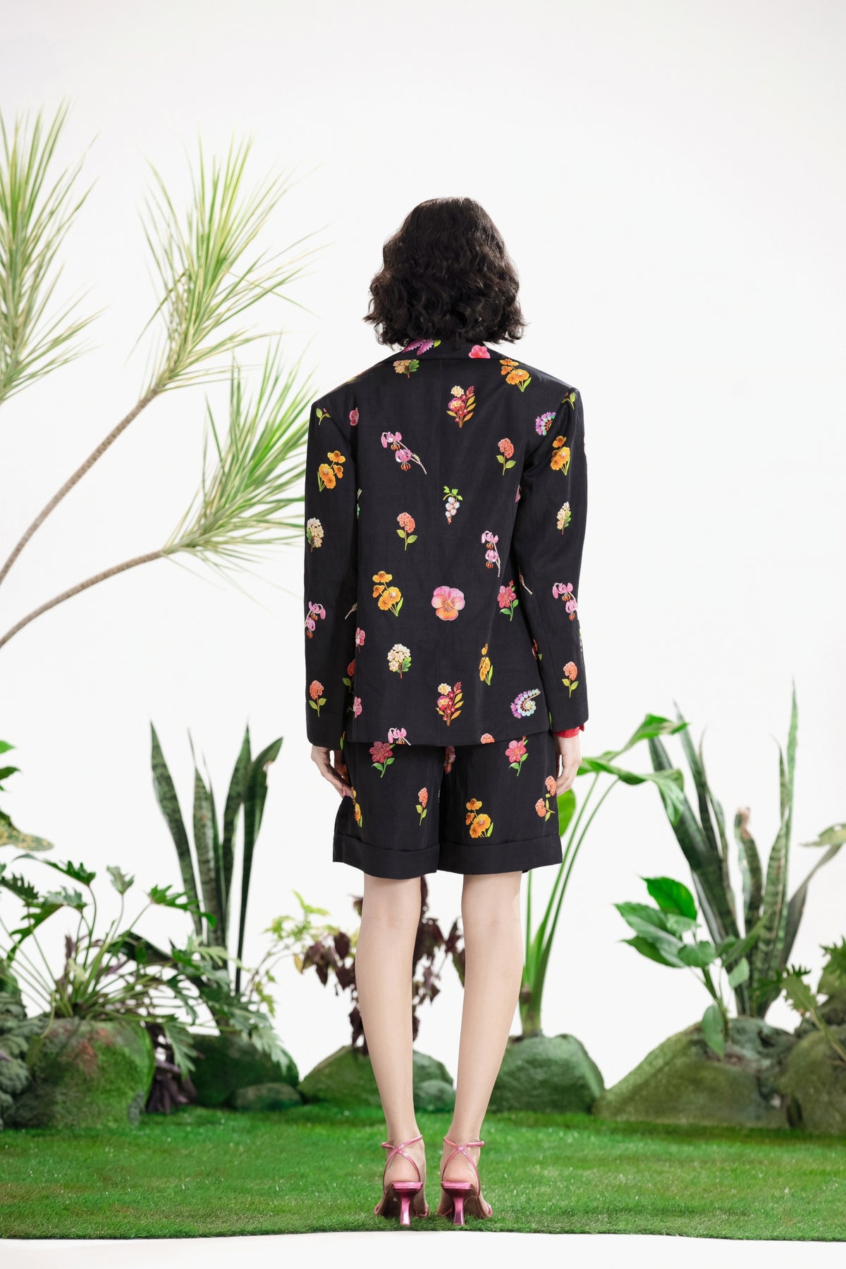 Elevate Your Wardrobe With This Statement Ensemble Featuring An Oversized Black Blazer Paired With Matching Satin-Linen Shorts. The Set Is Adorned With Bold Prints And Intricate Embroidery, Blending Contemporary Tailoring With Artisanal Detailing For A Striking, Fashion-Forward Look. Layered Underneath, A Playful Cow-Print Poplin Shirt Adds Contrast And Personality, Making The Outfit Perfect For Stylish Streetwear, Casual Events, Or Standout Occasions. A Versatile, Eye-Catching Set That Balances Structure, Artistry, And Playful Charm.