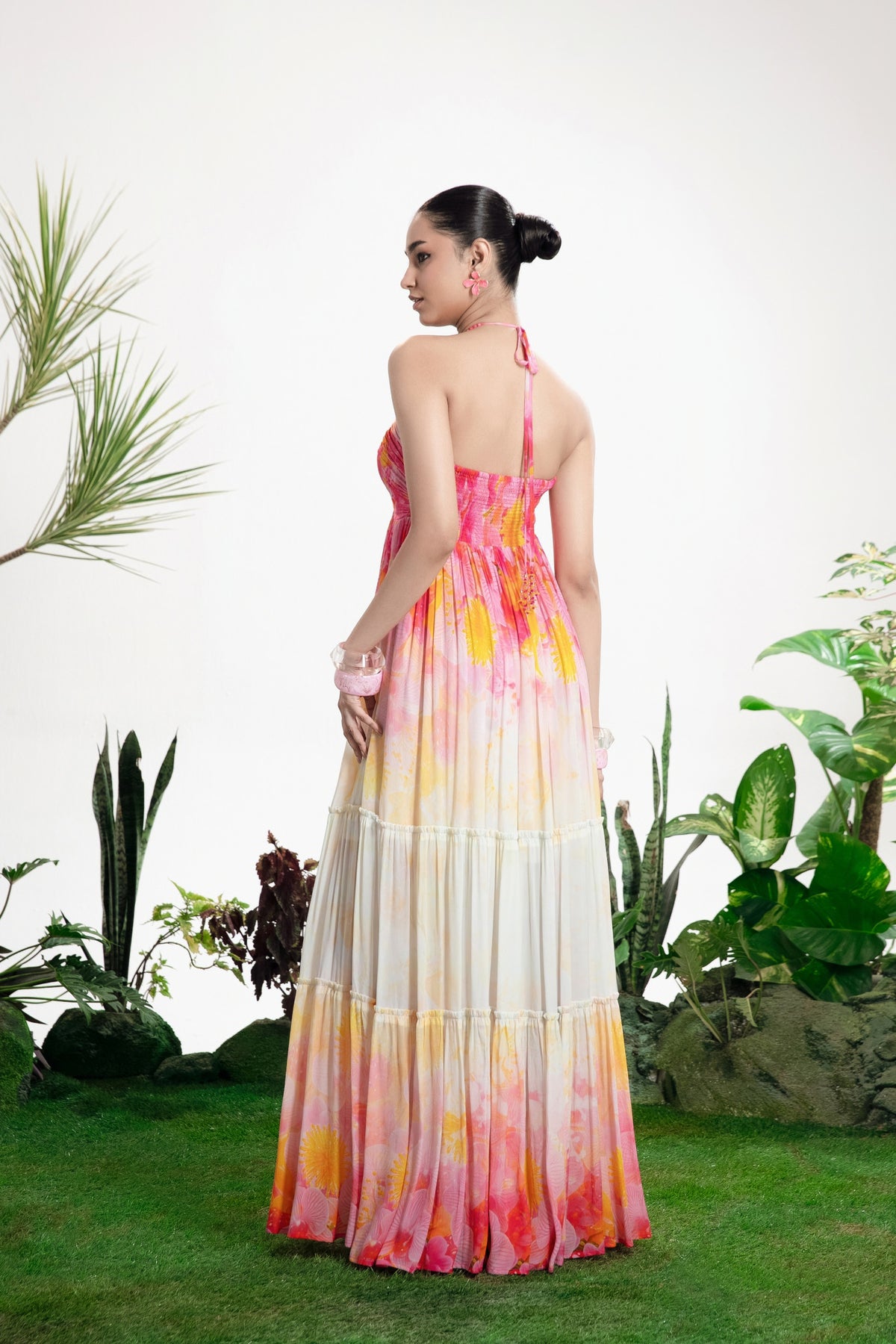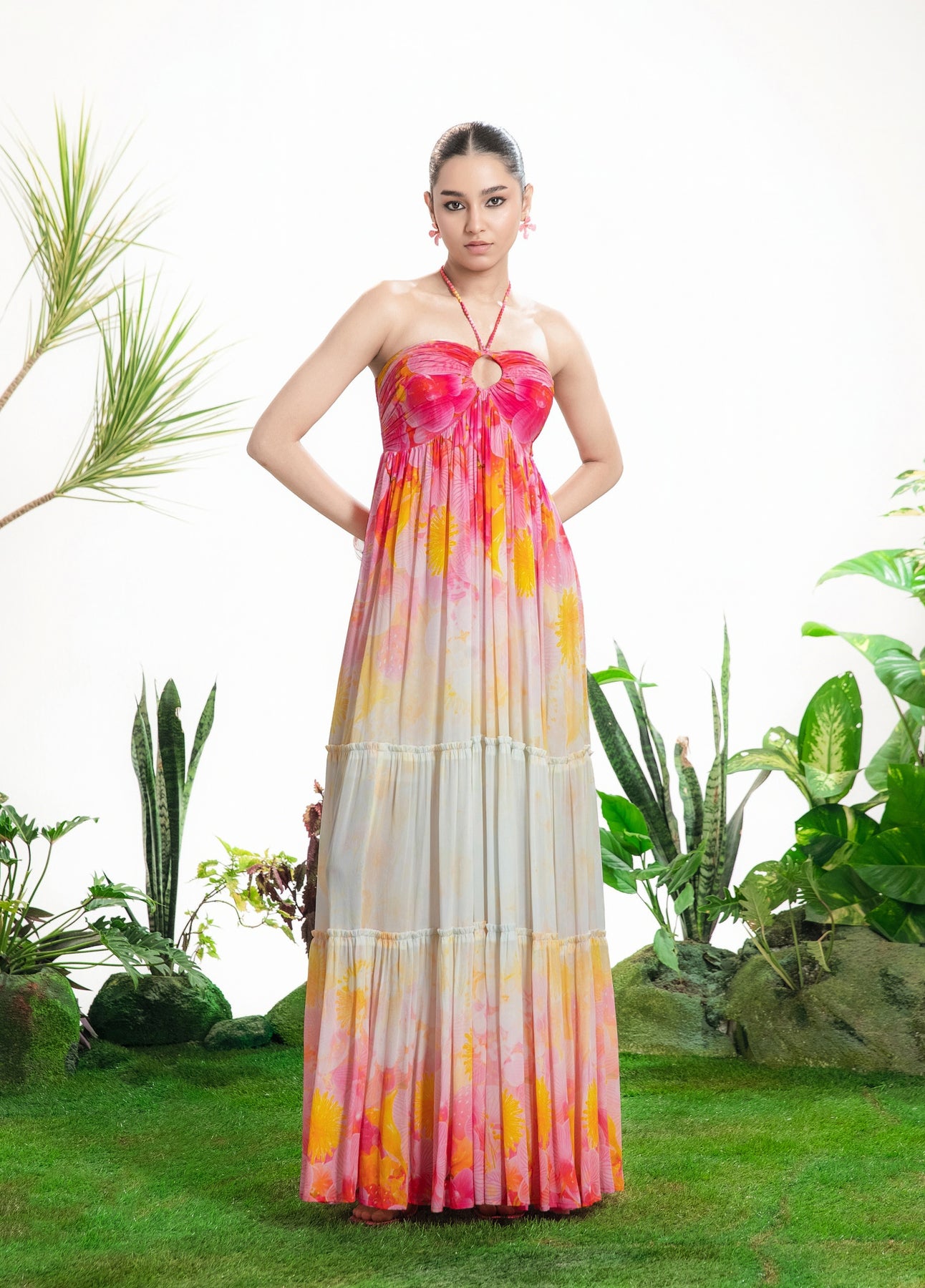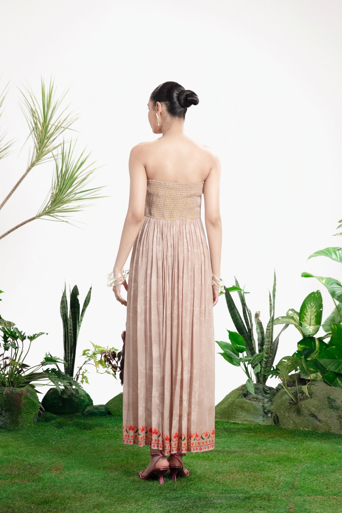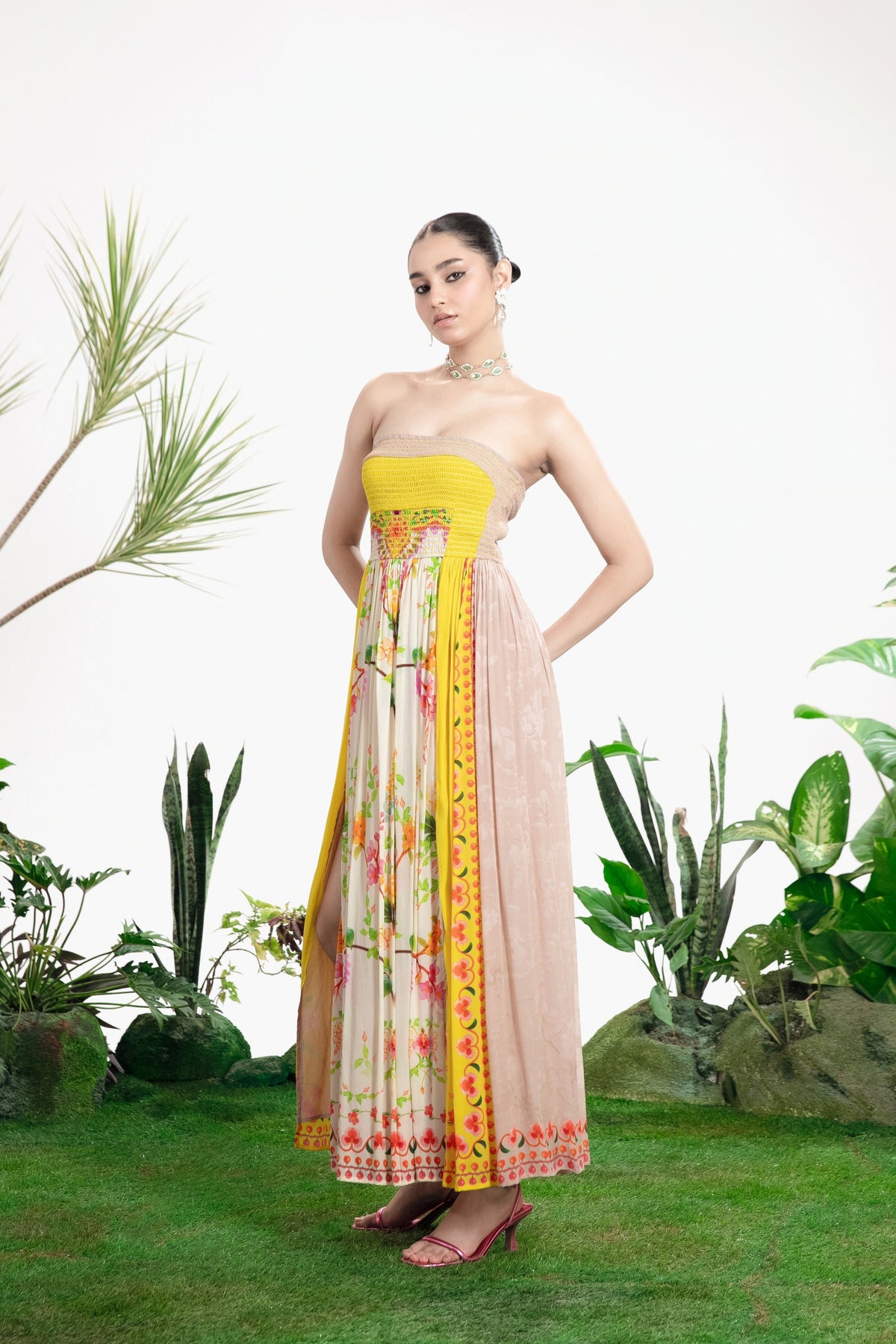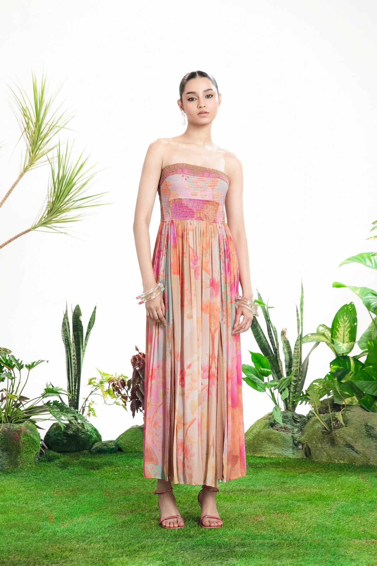 Elevate Your Style With This Feminine Strapless Empire-Line Dress Featuring Siddhartha Bansals Signature Print Style. Designed With Delicate Ruching On The Body, Tassel Strings At The Rear, And An Elasticated Back Panel For Comfort And Flexibility, This Printed Strapless Dress Is Perfect For Brunches, Daytime Parties, Casual Gatherings, And Stylish Everyday Wear. It Effortlessly Blends Playful Charm With Modern Sophistication.