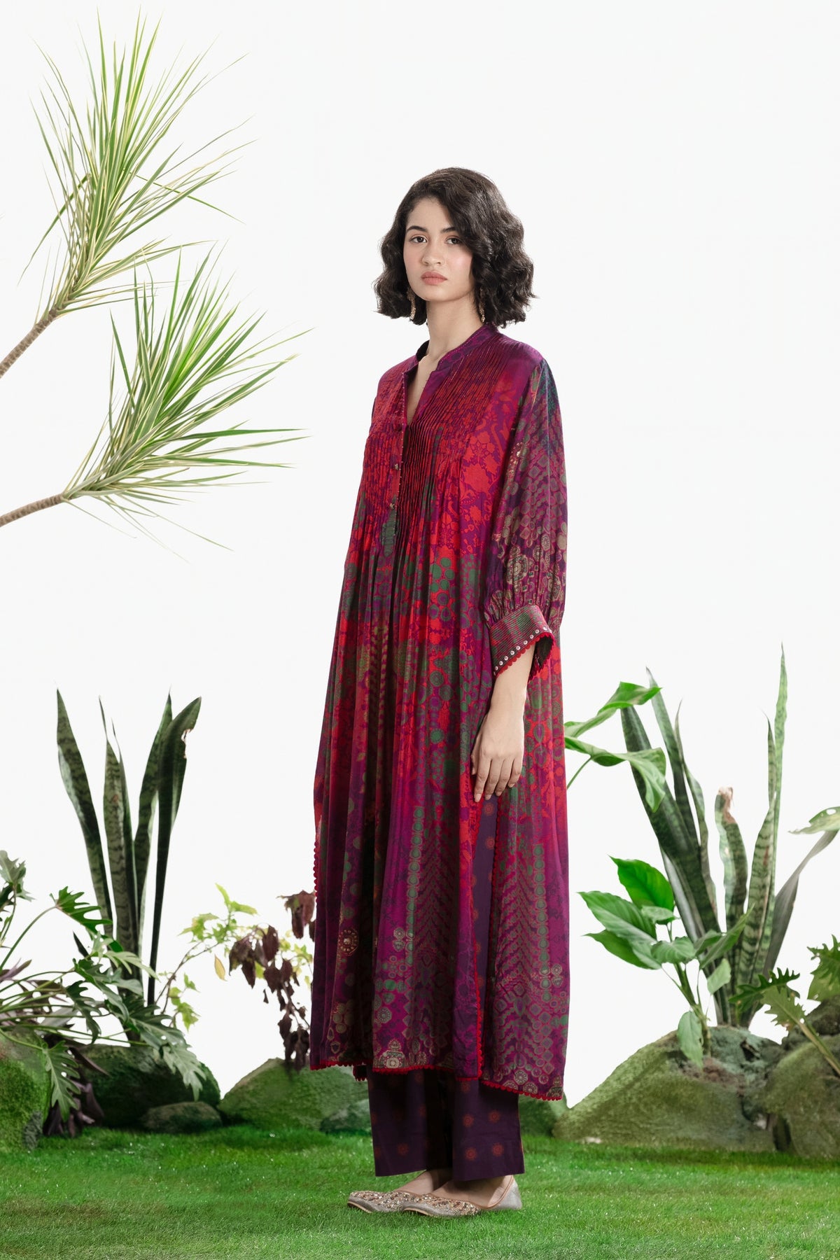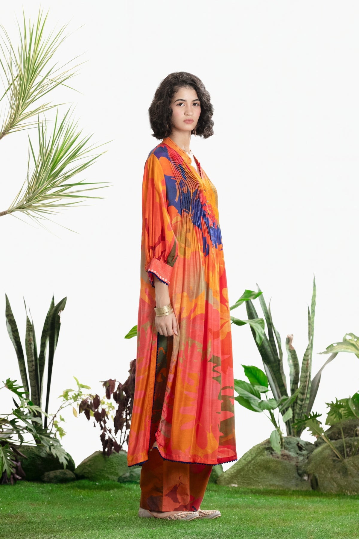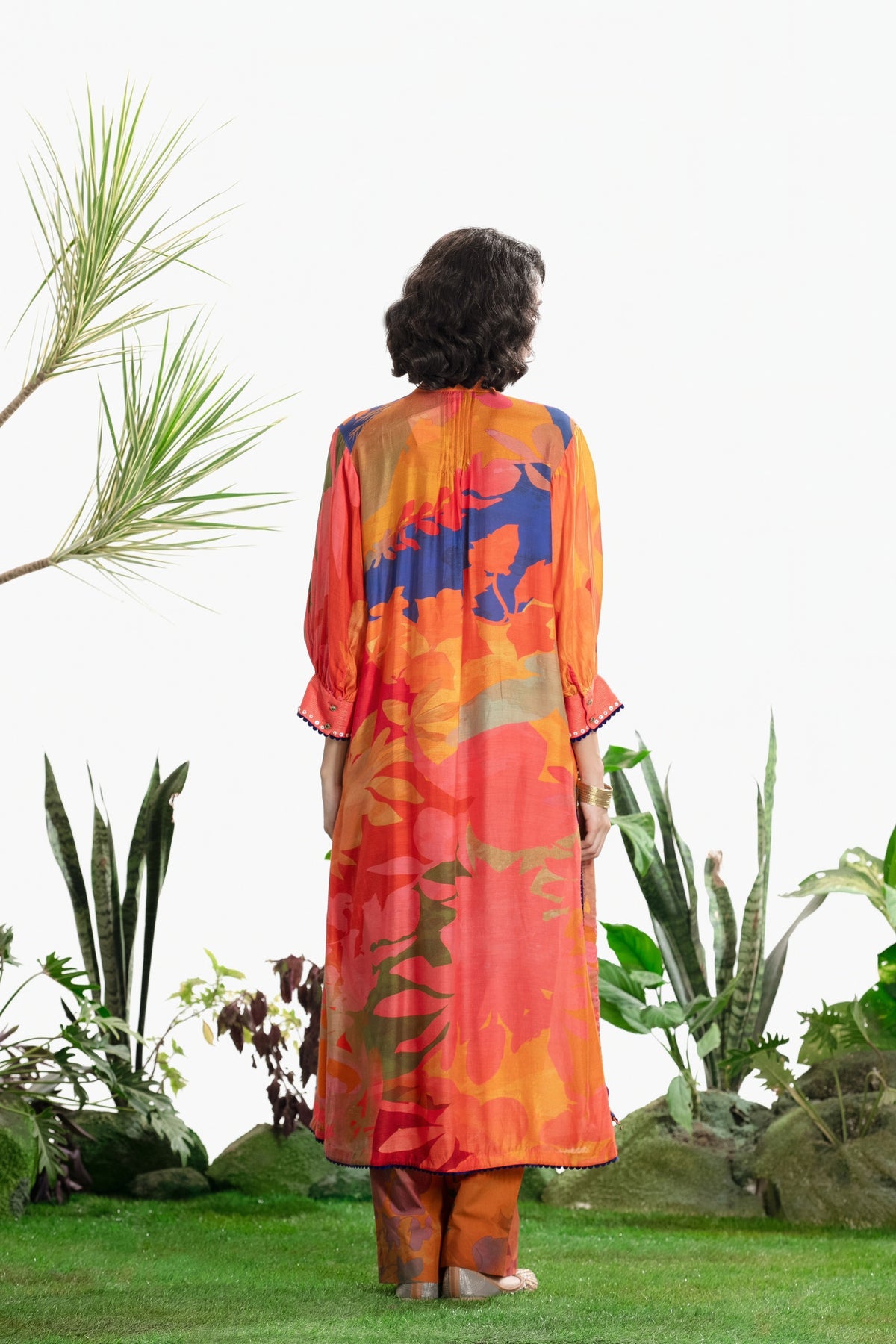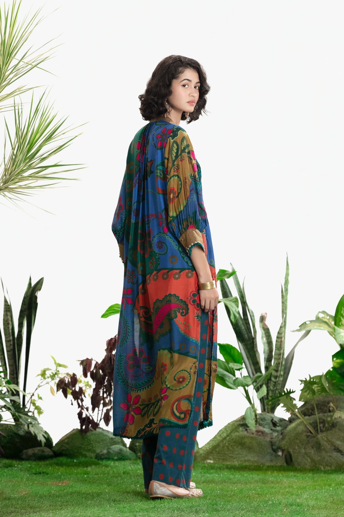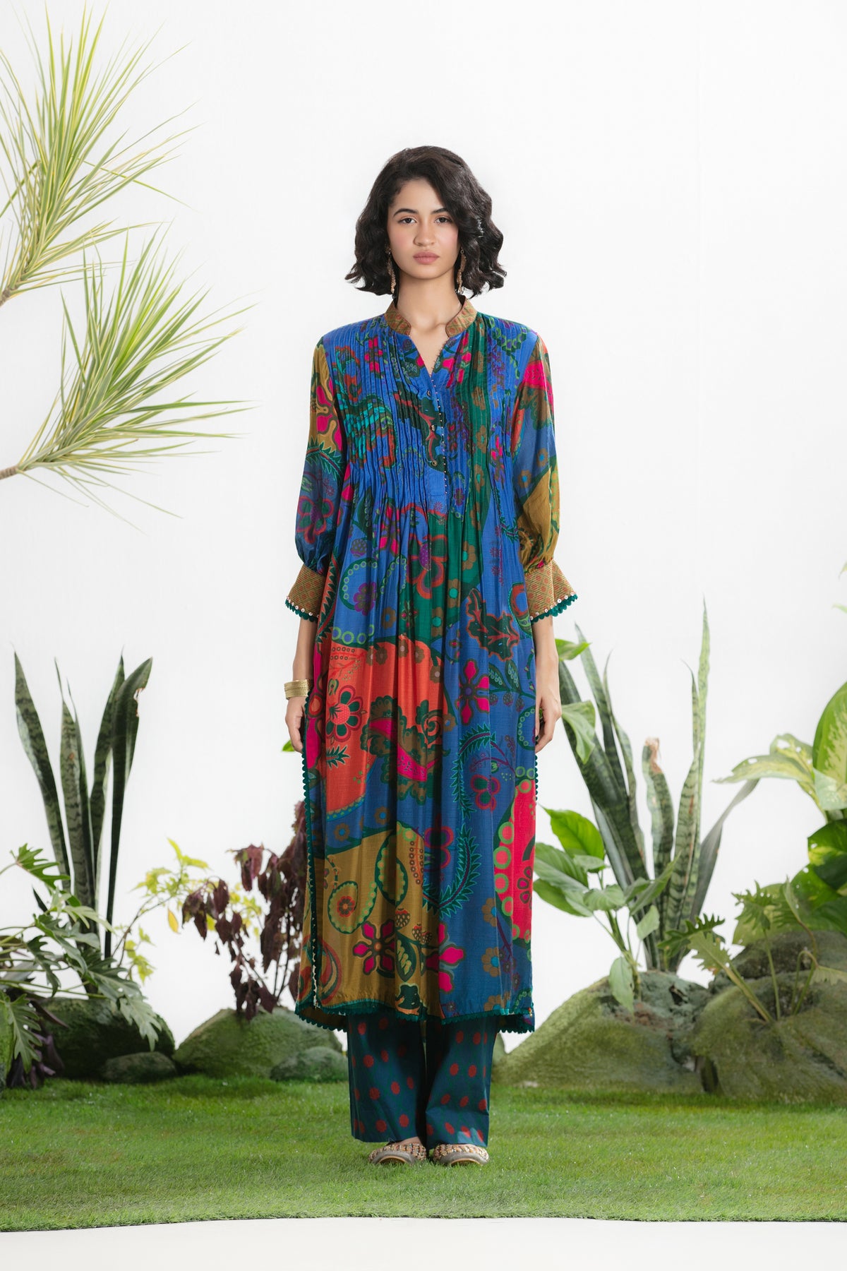 Multi color ikat print kurta set, designed with pintuck detailing on the front, threadwork on the collar, and lace detailing along the hem.Perfect for casual festive gatherings, family get-togethers, or elegant daytime outings.
