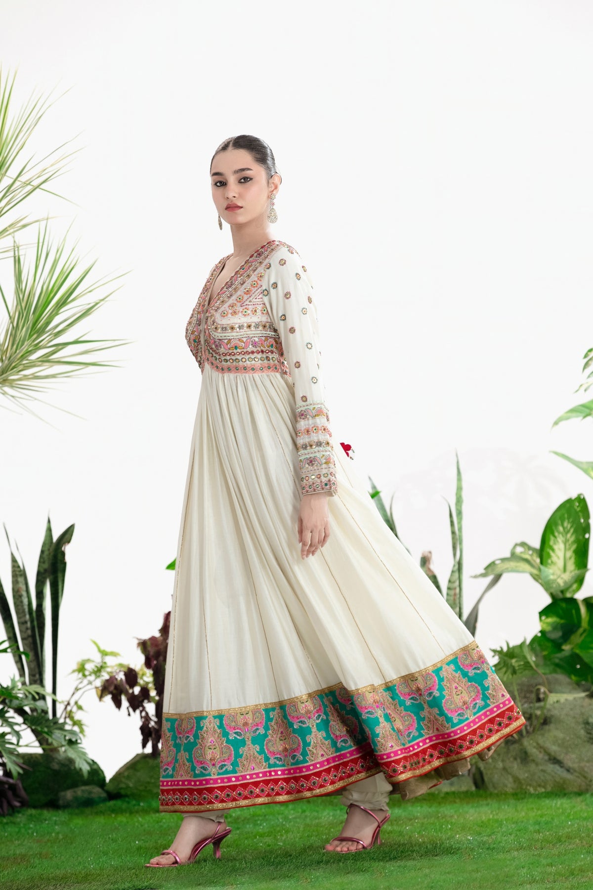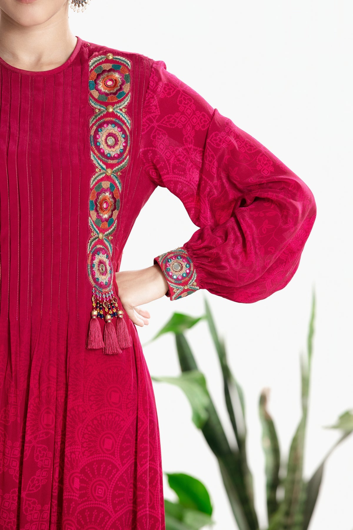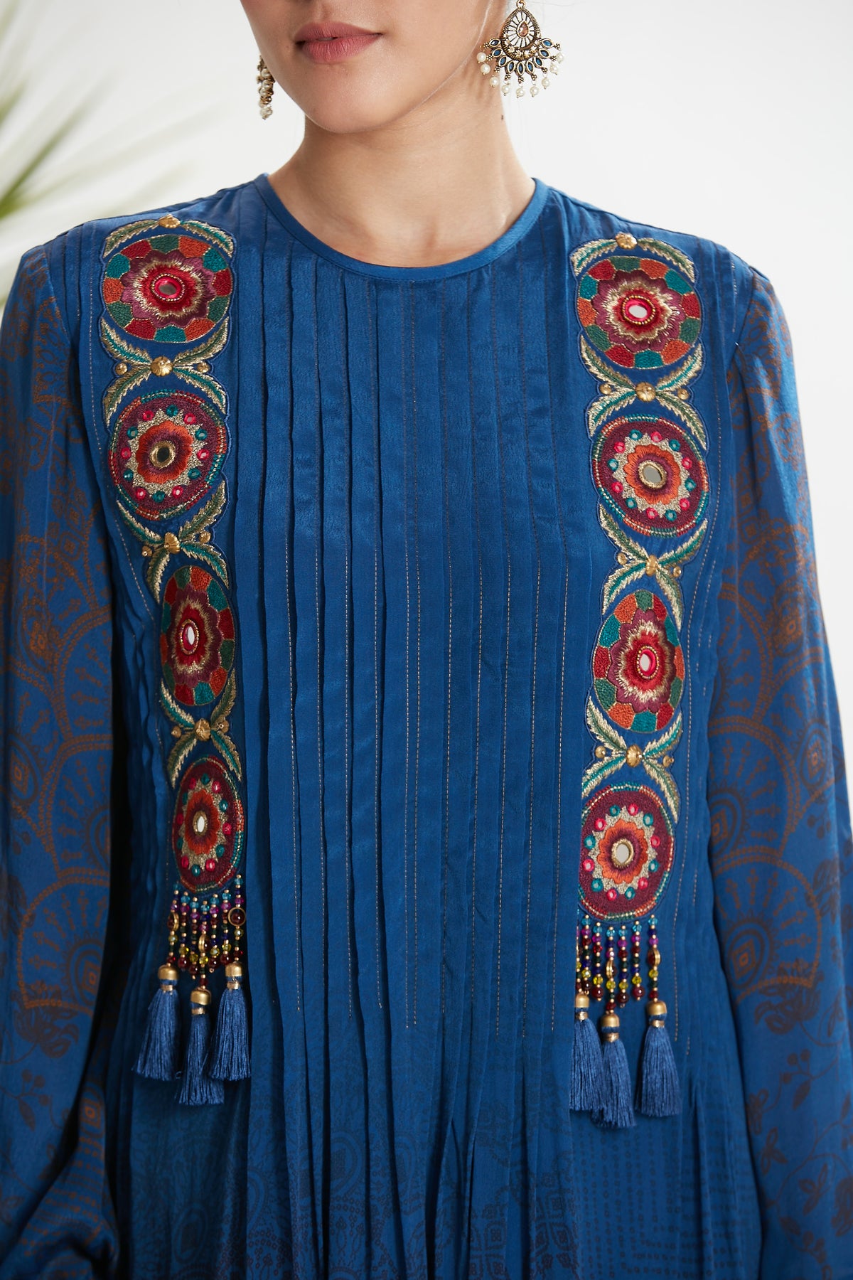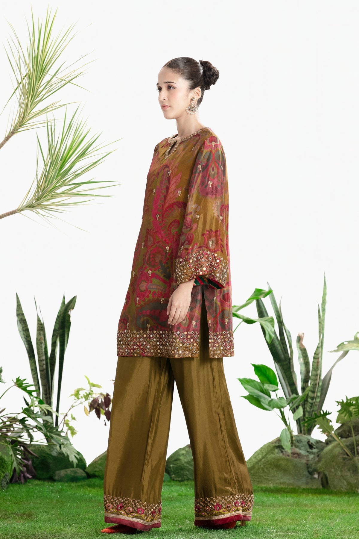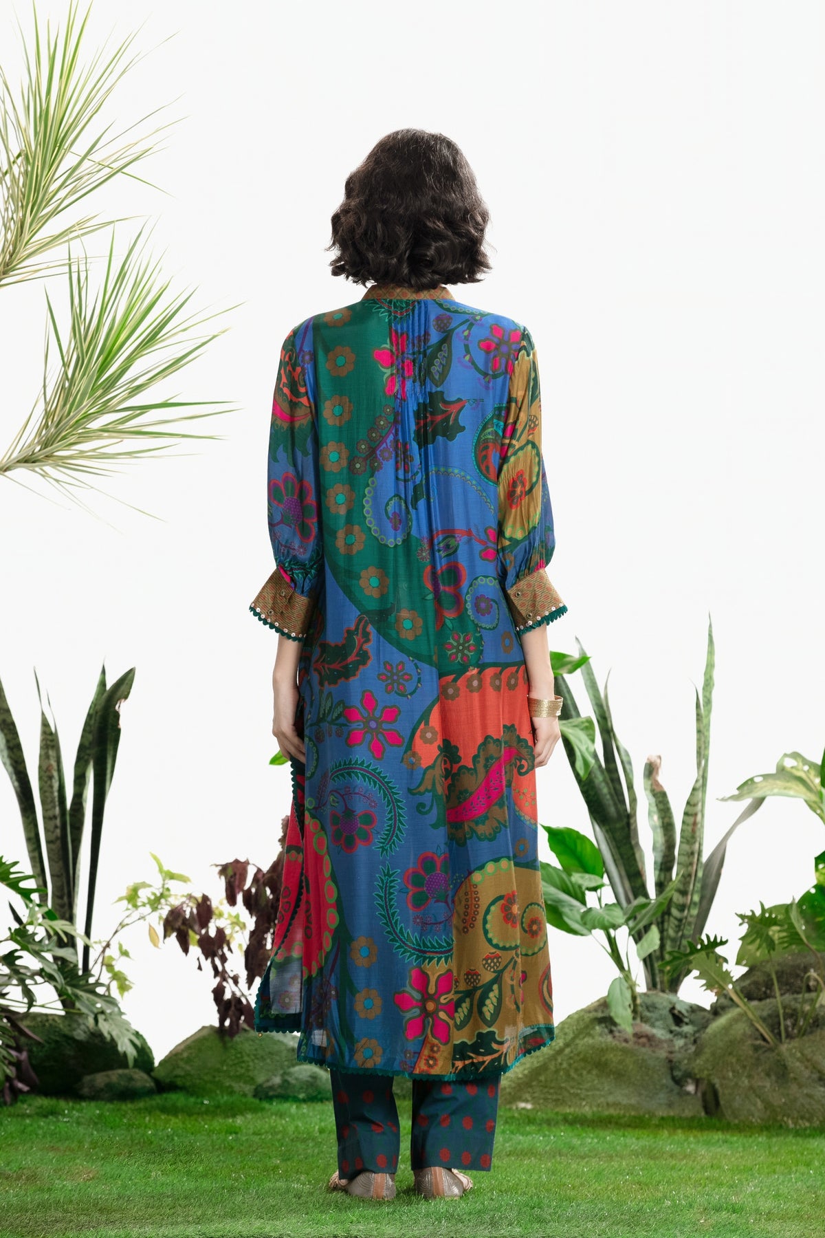 Multi color ikat print kurta set, designed with pintuck detailing on the front, threadwork on the collar, and lace detailing along the hem.Perfect for casual festive gatherings, family get-togethers, or elegant daytime outings.