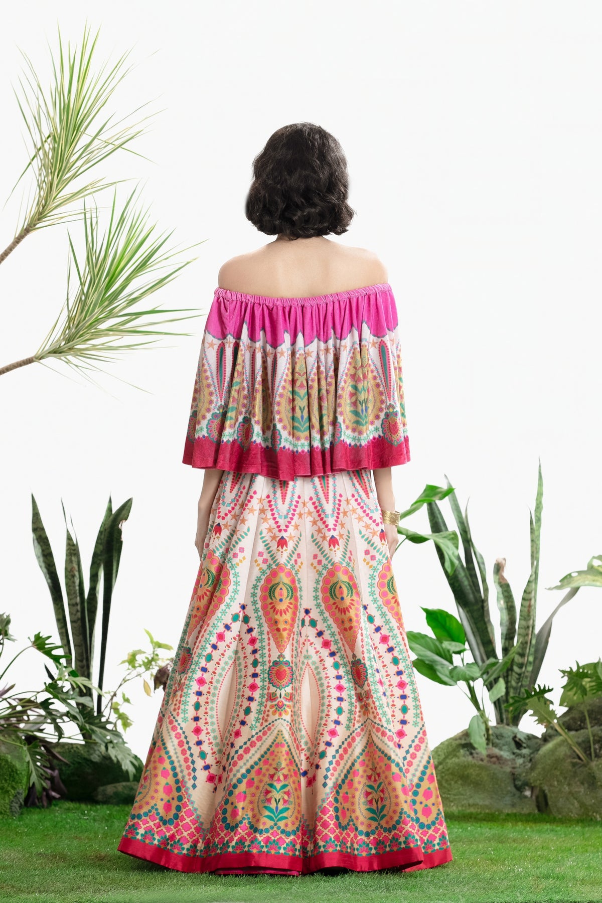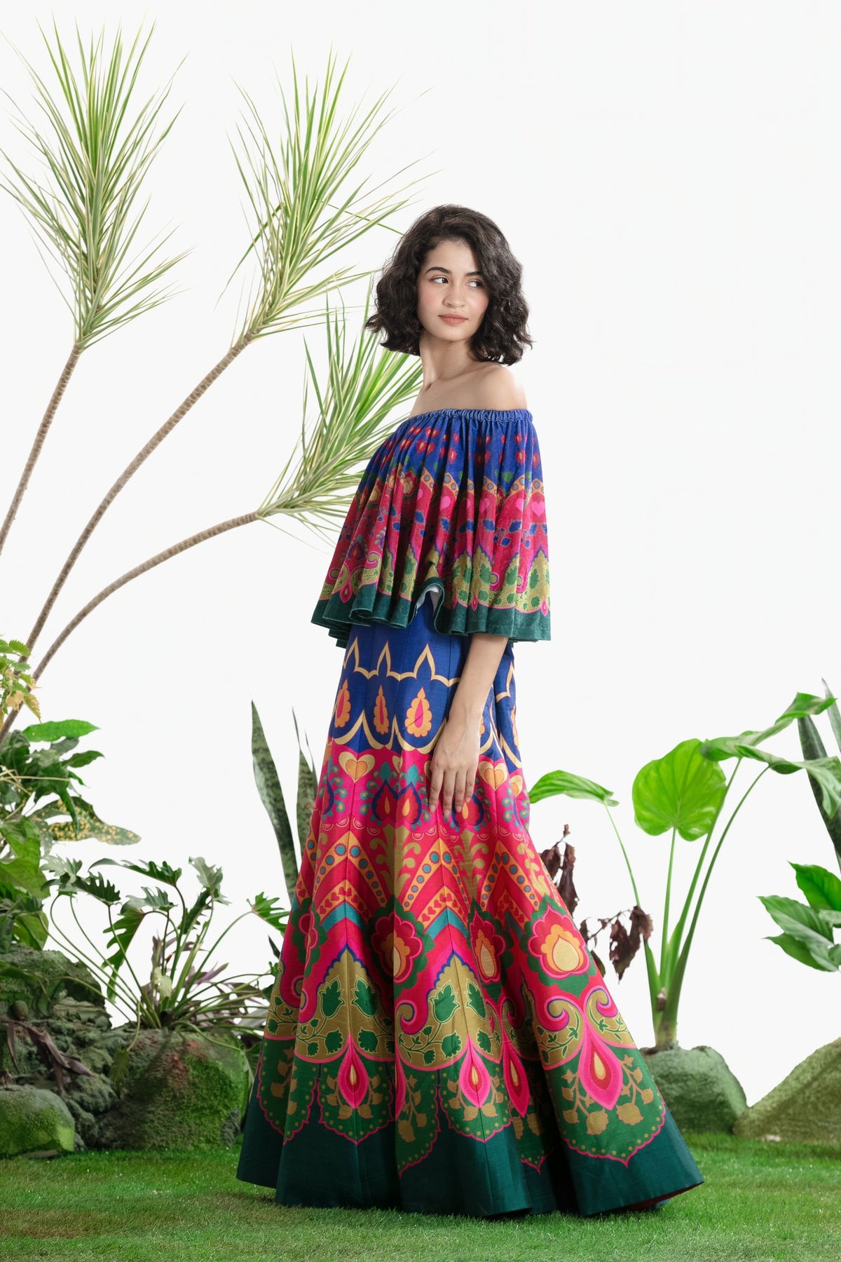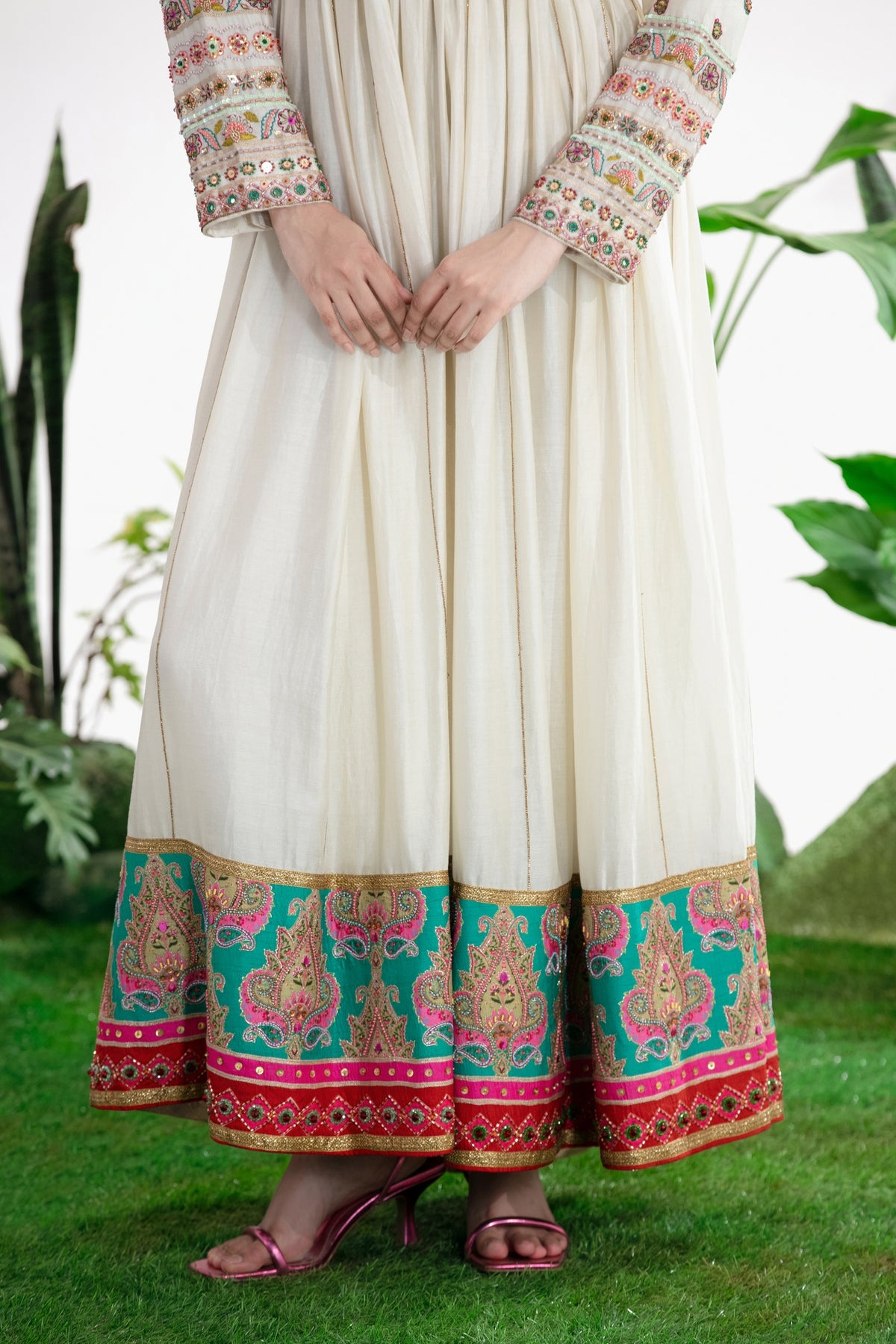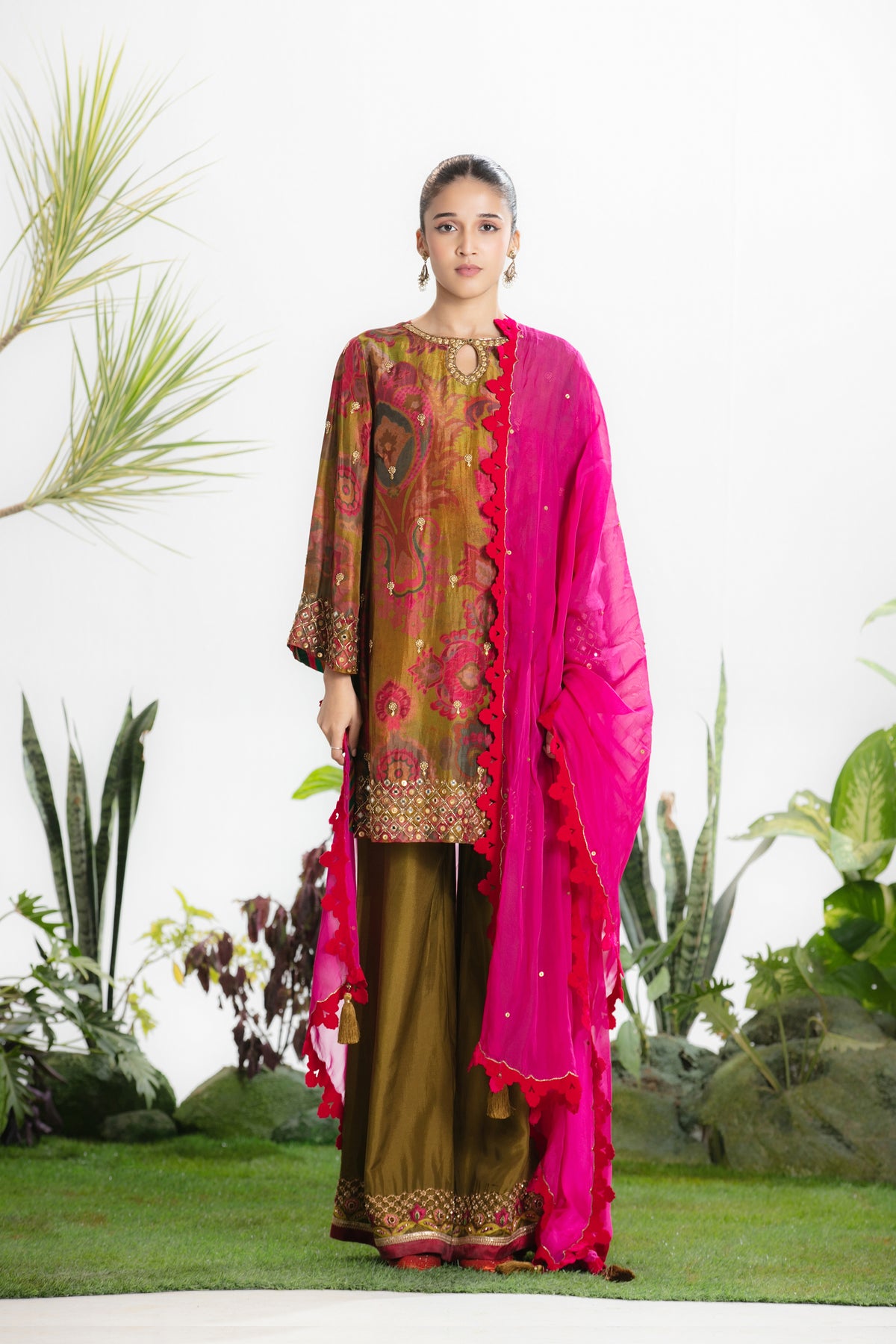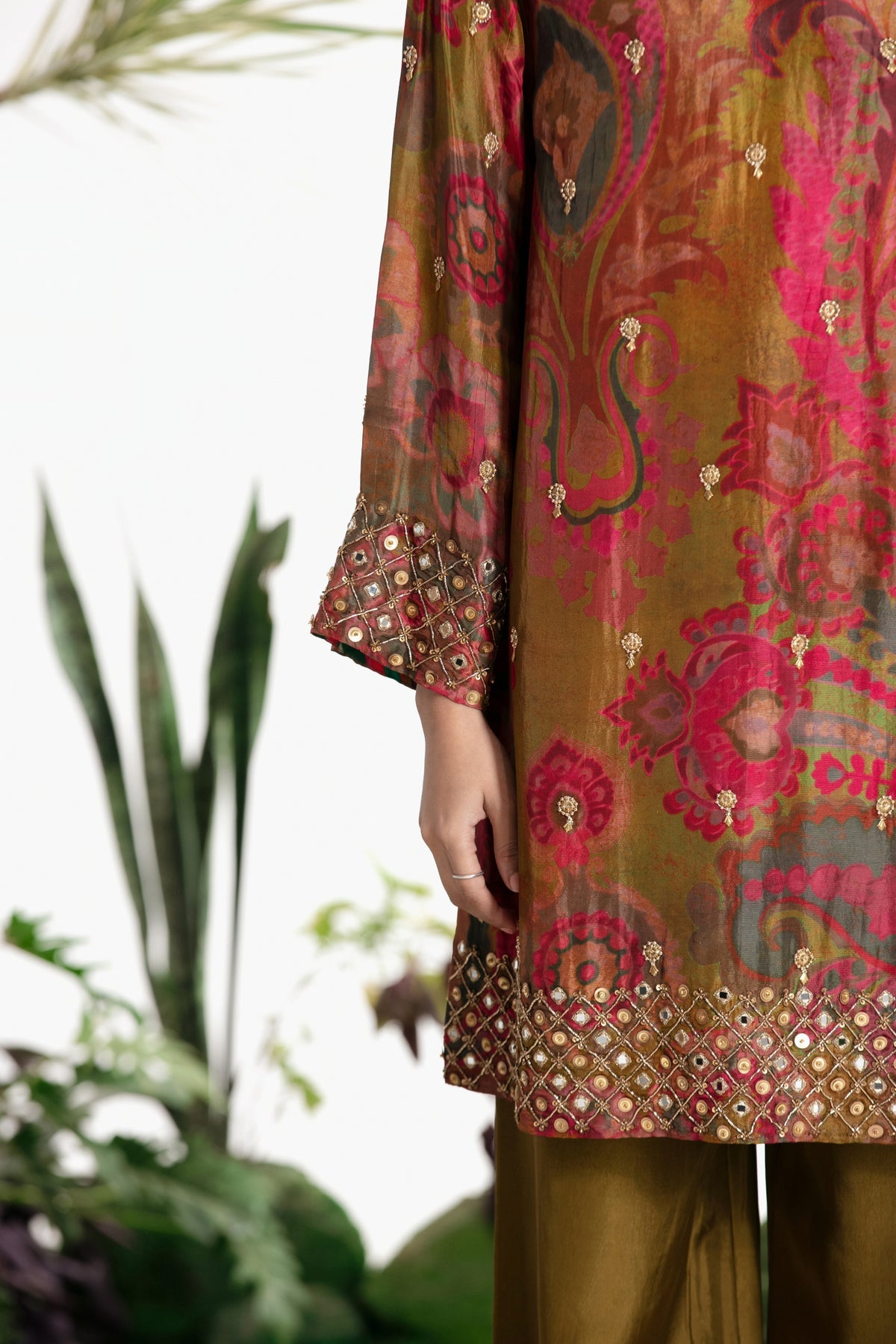 Multi color ikat print kurta set, designed with pintuck detailing on the front, threadwork on the collar, and lace detailing along the hem.Perfect for casual festive gatherings, family get-togethers, or elegant daytime outings.
