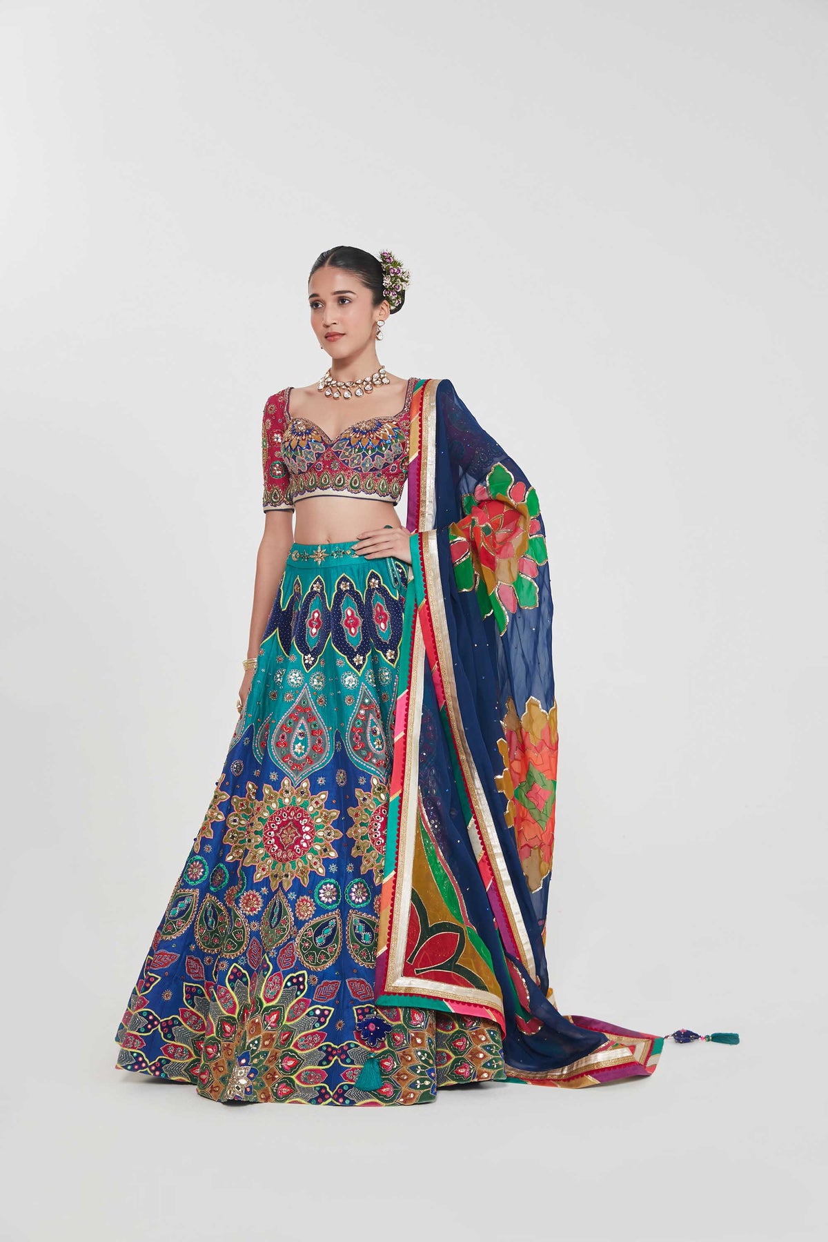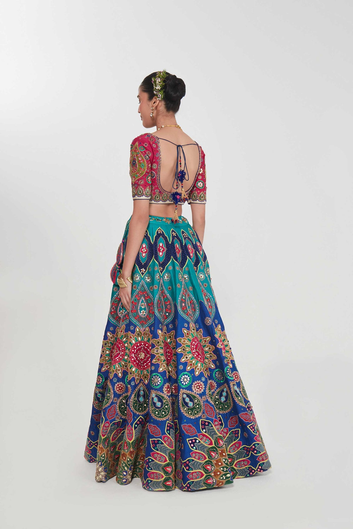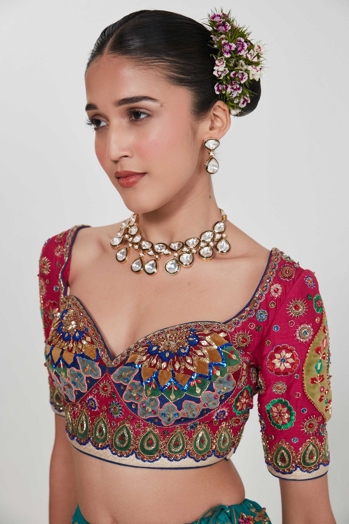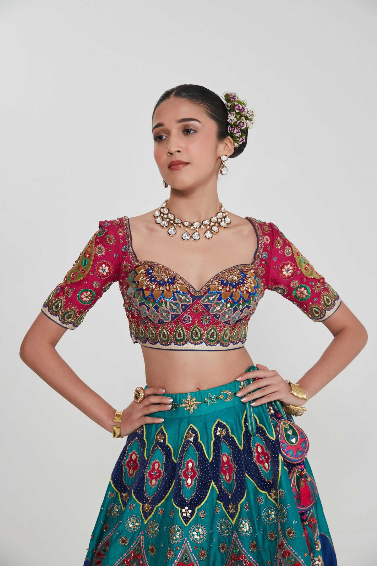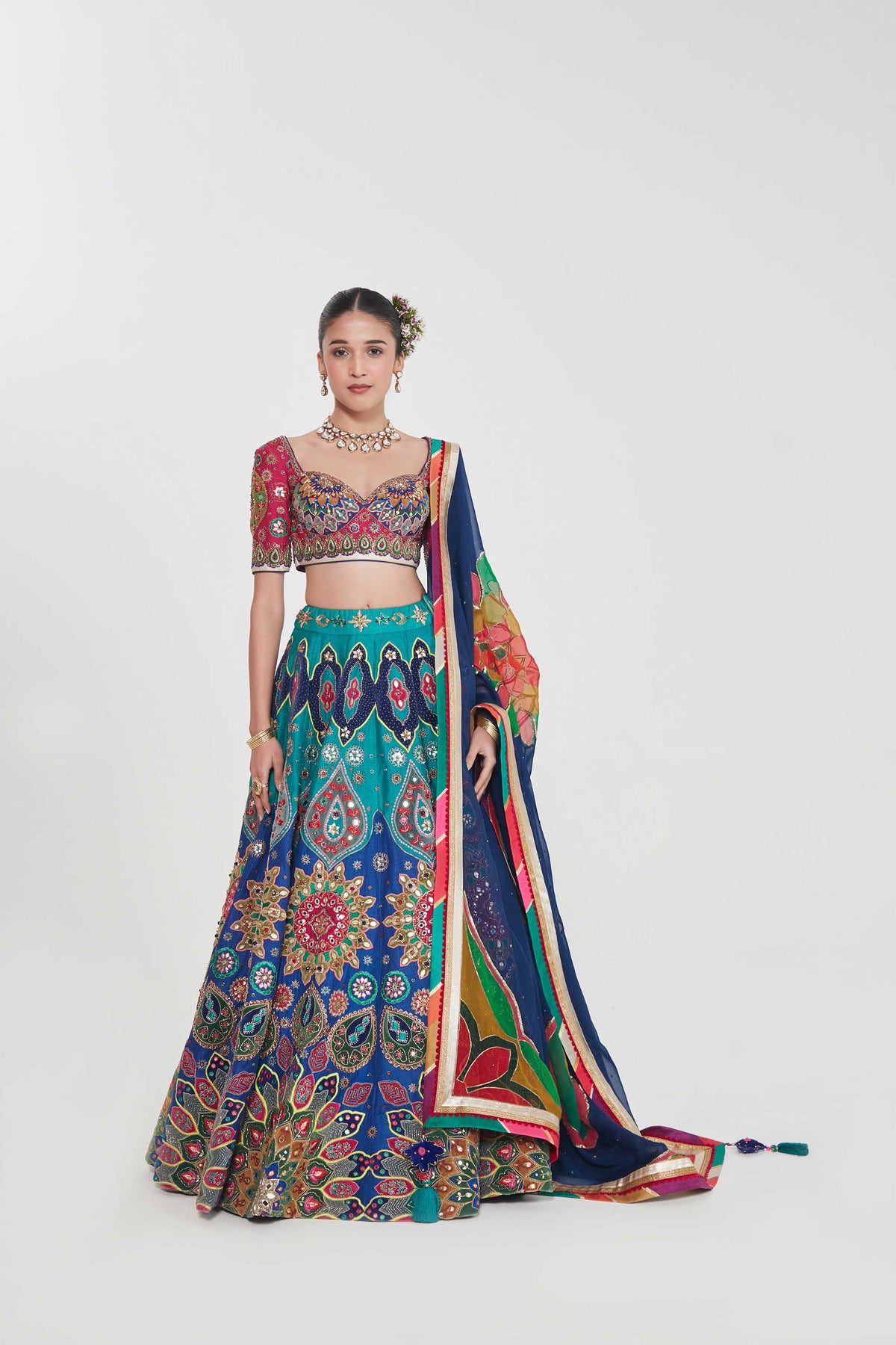 Teal And Multicolor Silk Lehenga Set Featuring Intricate Patch Work, Sequin And Resham Embroidery In Bold Floral And Kaleidoscopic Patterns. Paired With A Hand-Embroidered Pink Blouse And A Navy Blue Dupatta Highlighted With Vibrant Prints And A Gold Border.
