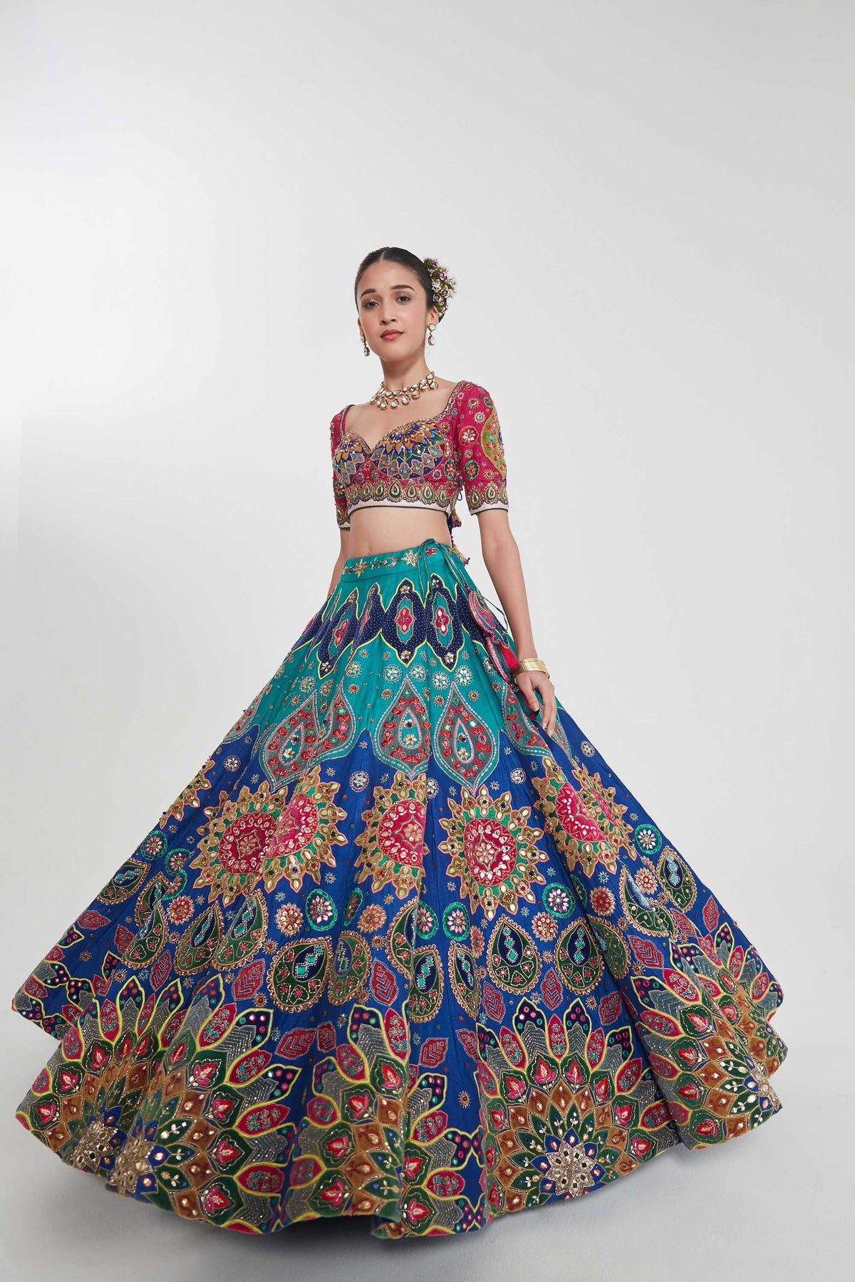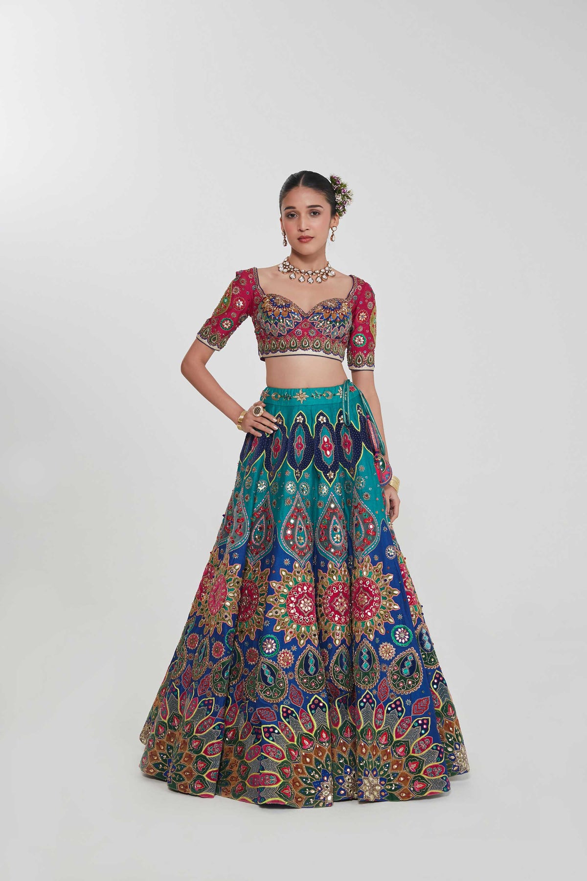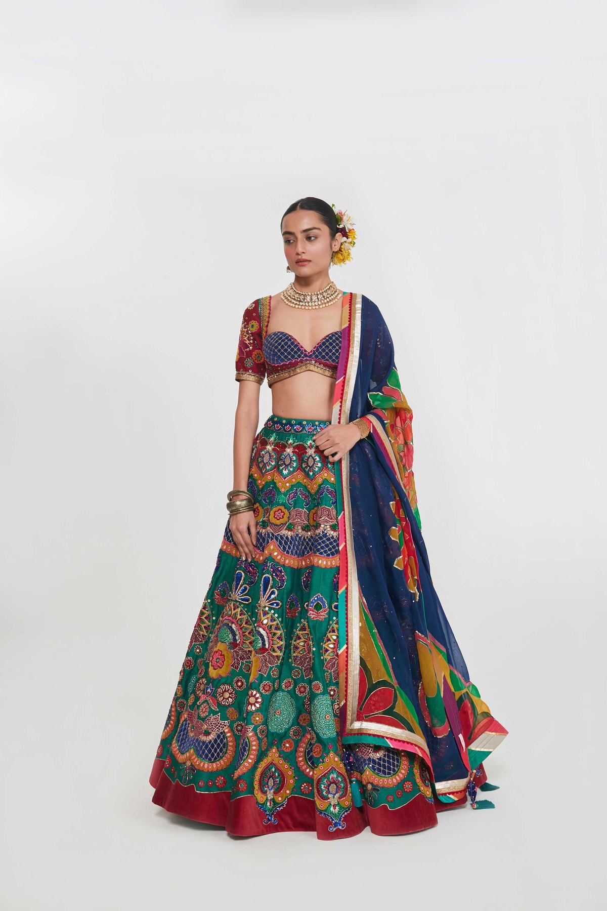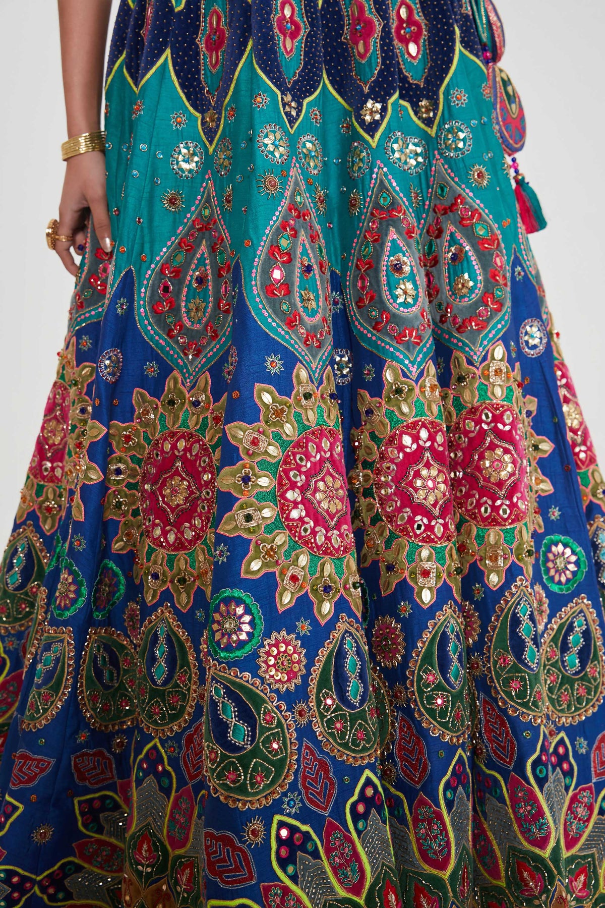 Teal And Multicolor Silk Lehenga Set Featuring Intricate Patch Work, Sequin And Resham Embroidery In Bold Floral And Kaleidoscopic Patterns. Paired With A Hand-Embroidered Pink Blouse And A Navy Blue Dupatta Highlighted With Vibrant Prints And A Gold Border.