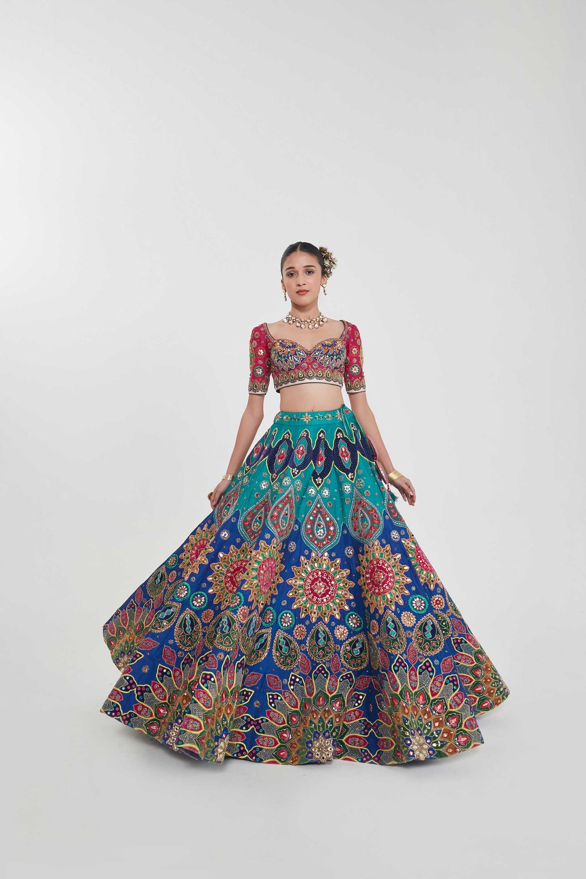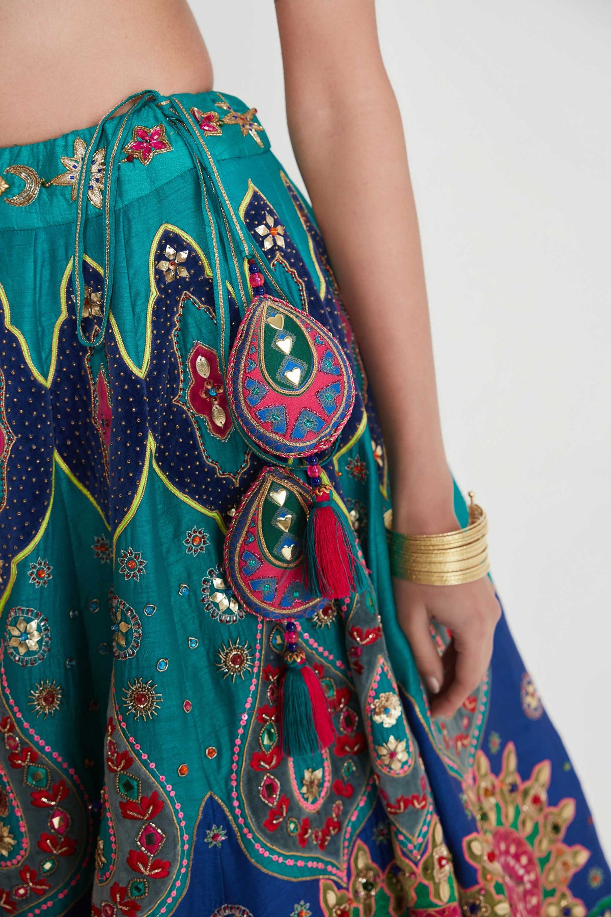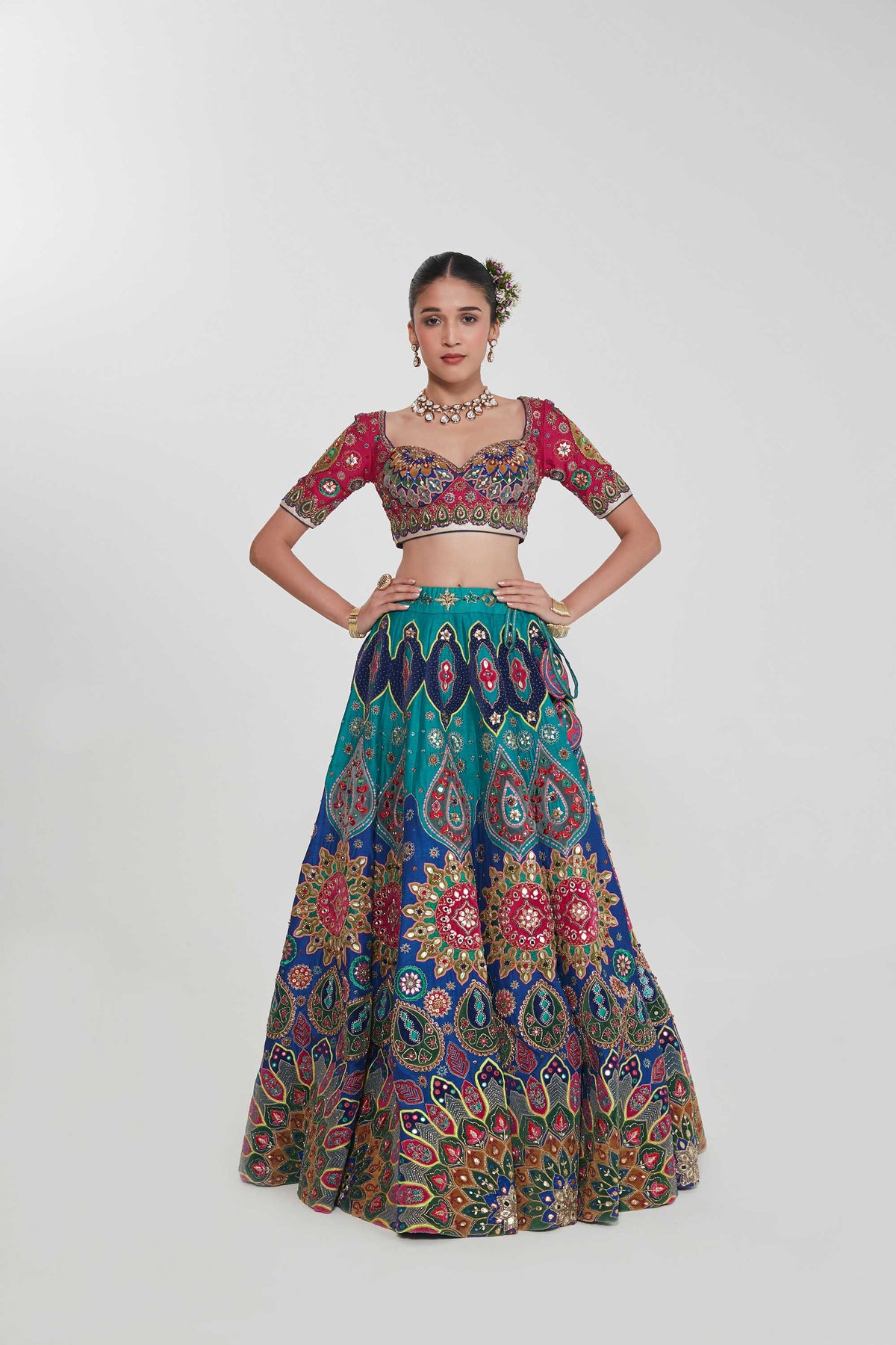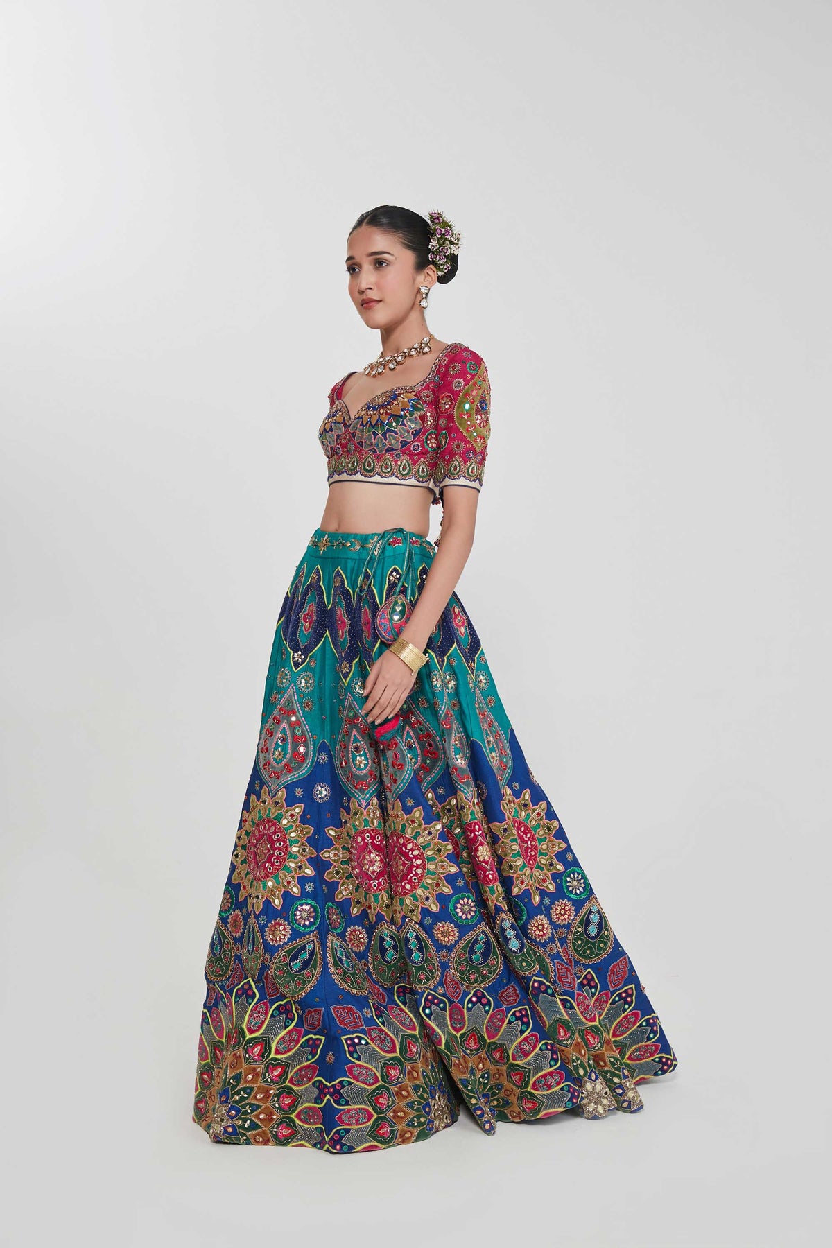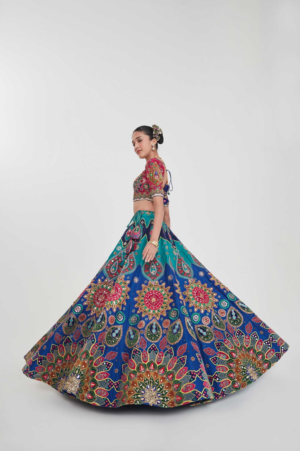 Teal And Multicolor Silk Lehenga Set Featuring Intricate Patch Work, Sequin And Resham Embroidery In Bold Floral And Kaleidoscopic Patterns. Paired With A Hand-Embroidered Pink Blouse And A Navy Blue Dupatta Highlighted With Vibrant Prints And A Gold Border.