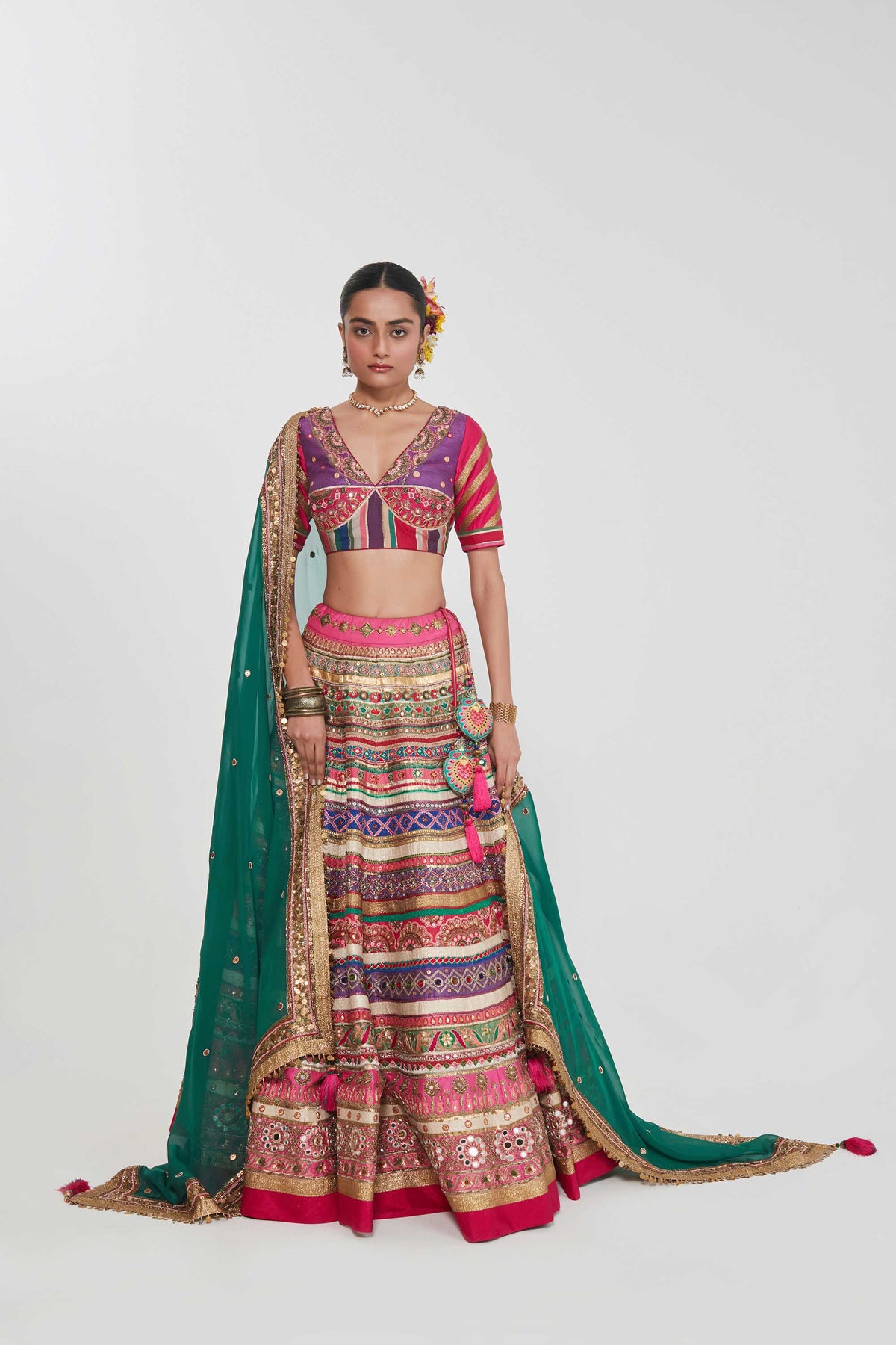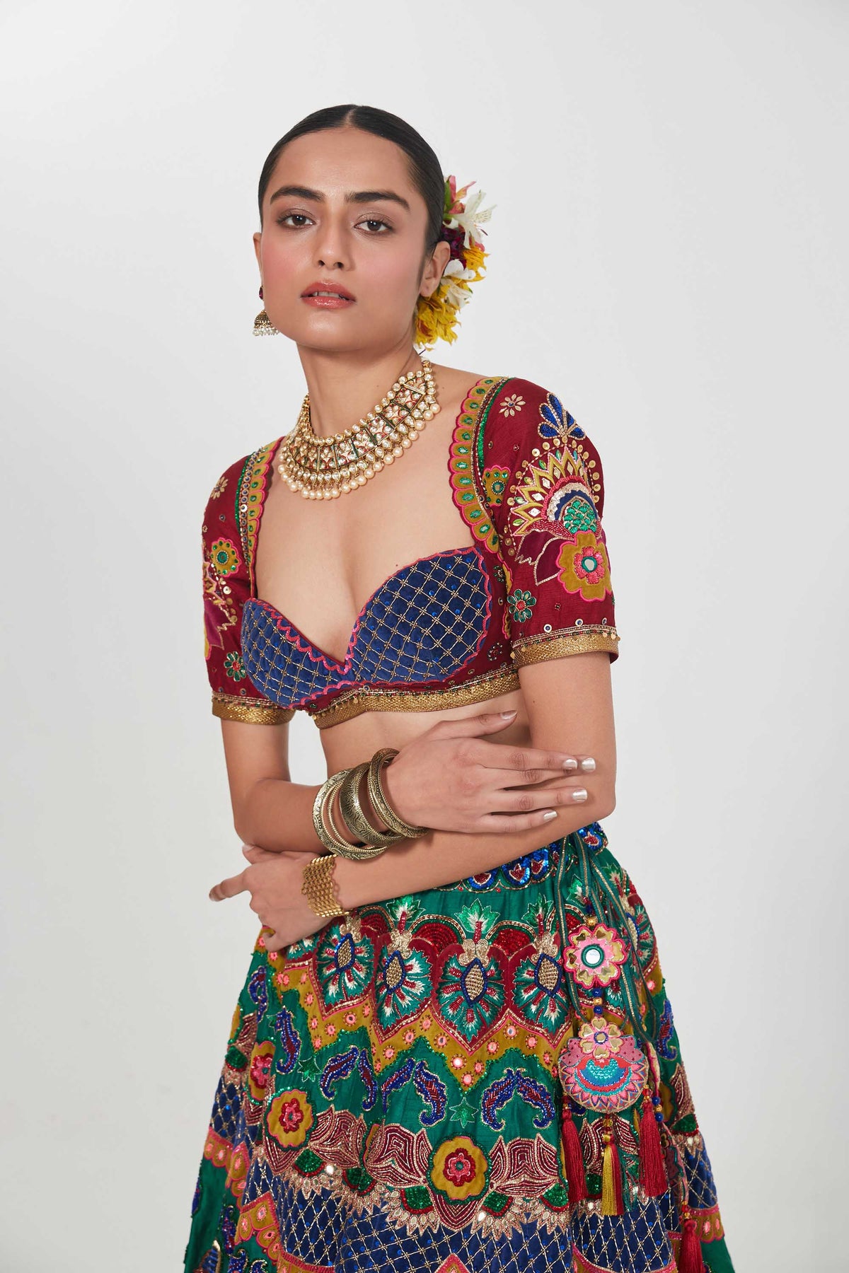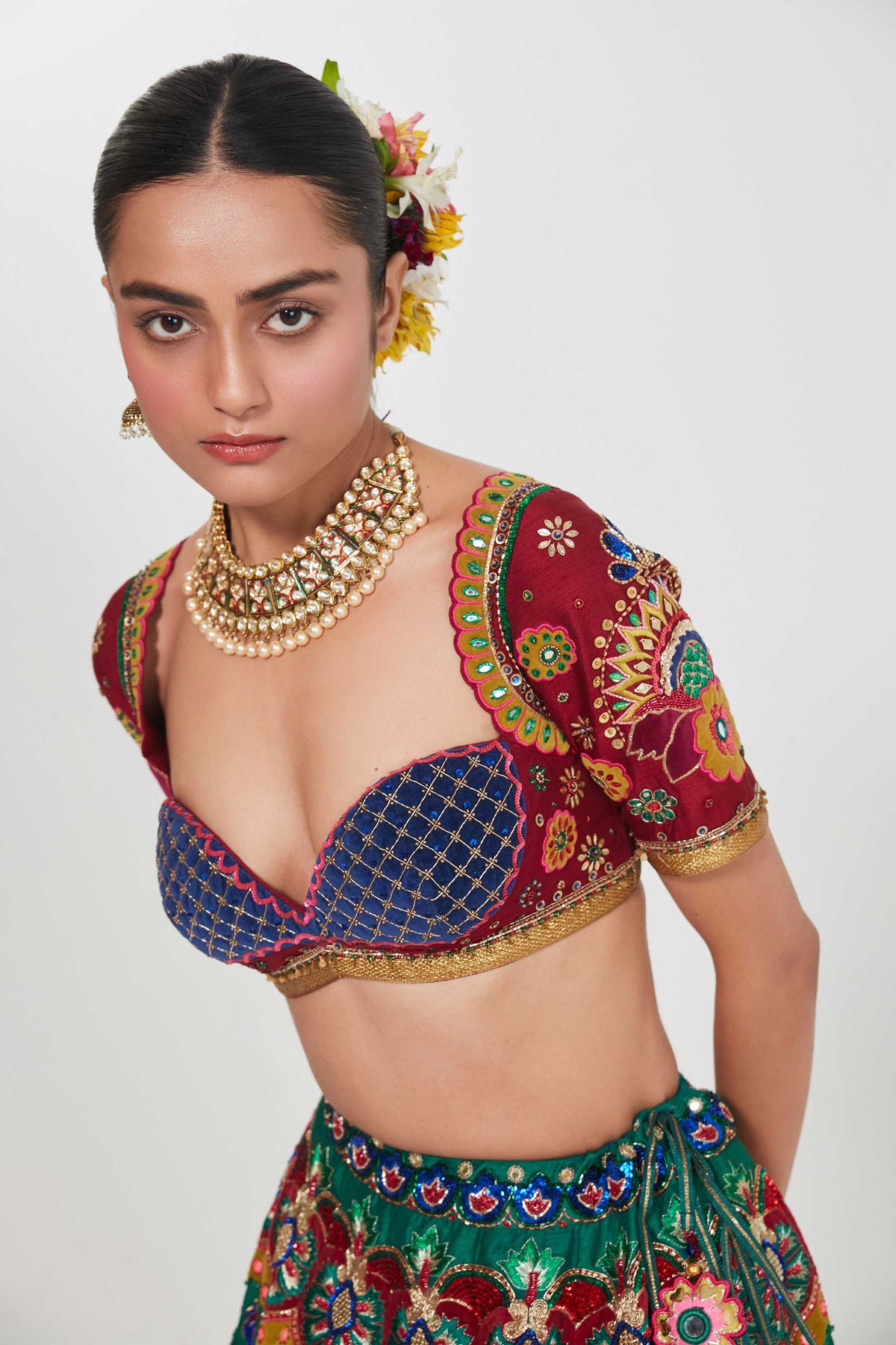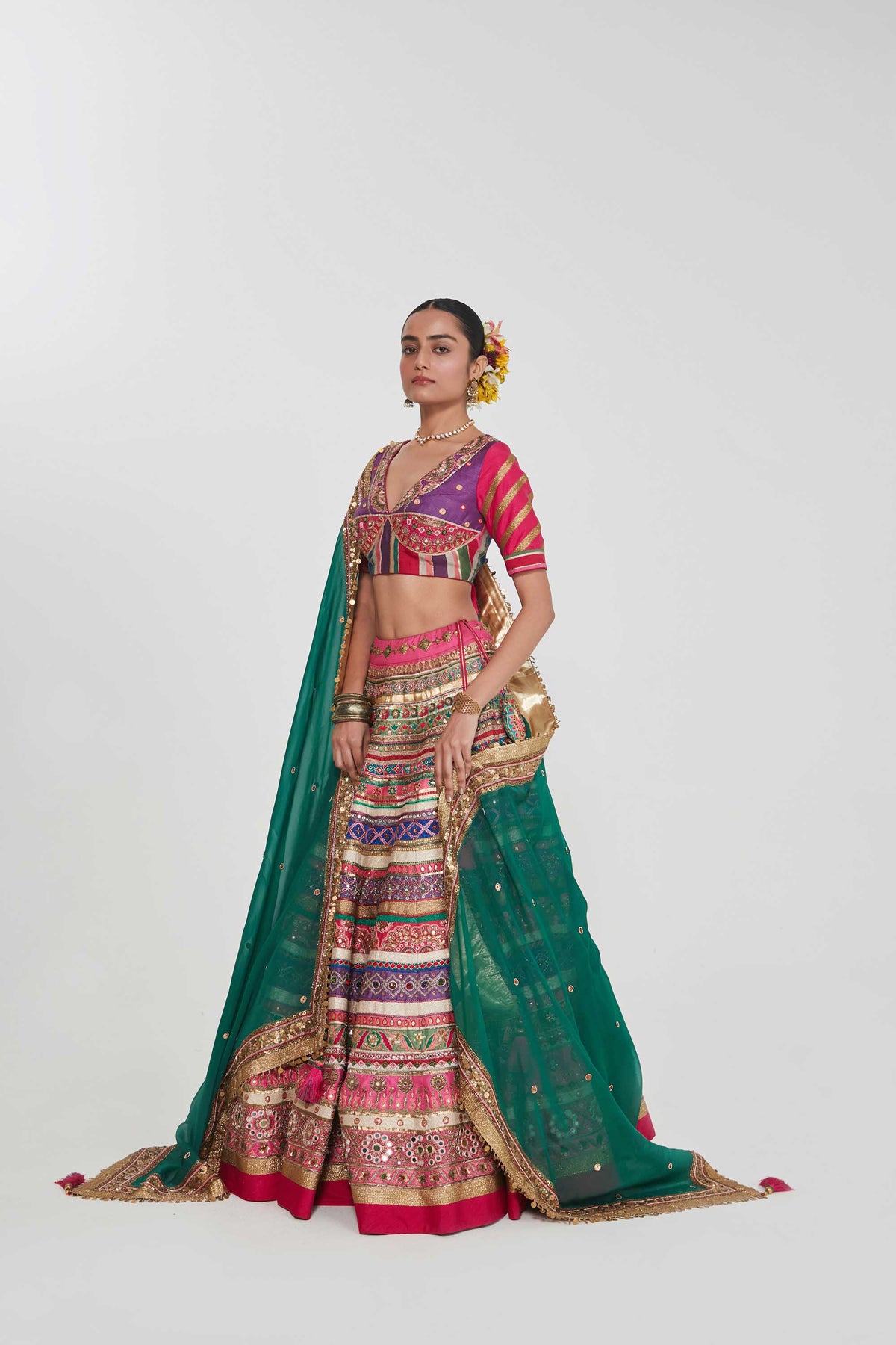 Teal And Multicolor Silk Lehenga Set Featuring Intricate Patch Work, Sequin And Resham Embroidery In Bold Floral And Kaleidoscopic Patterns. Paired With A Hand-Embroidered Pink Blouse And A Navy Blue Dupatta Highlighted With Vibrant Prints And A Gold Border.
