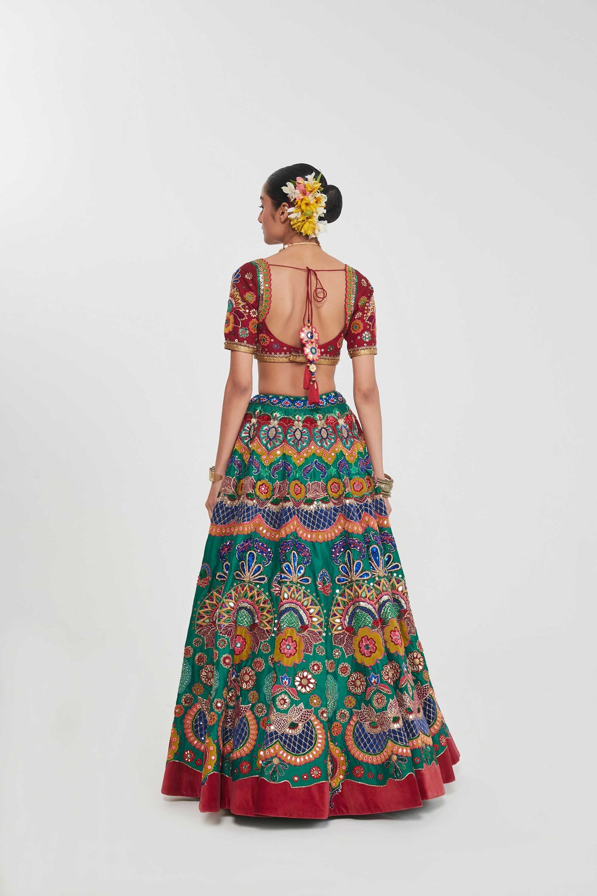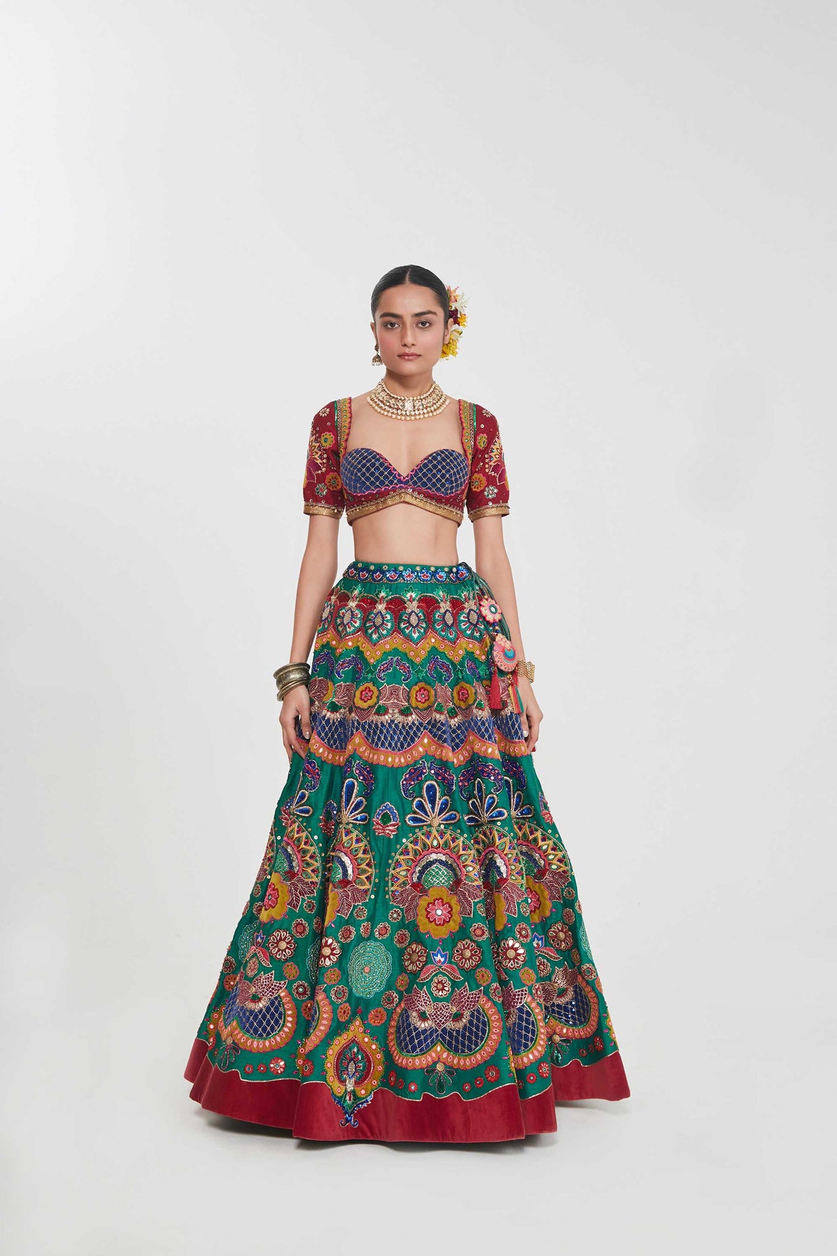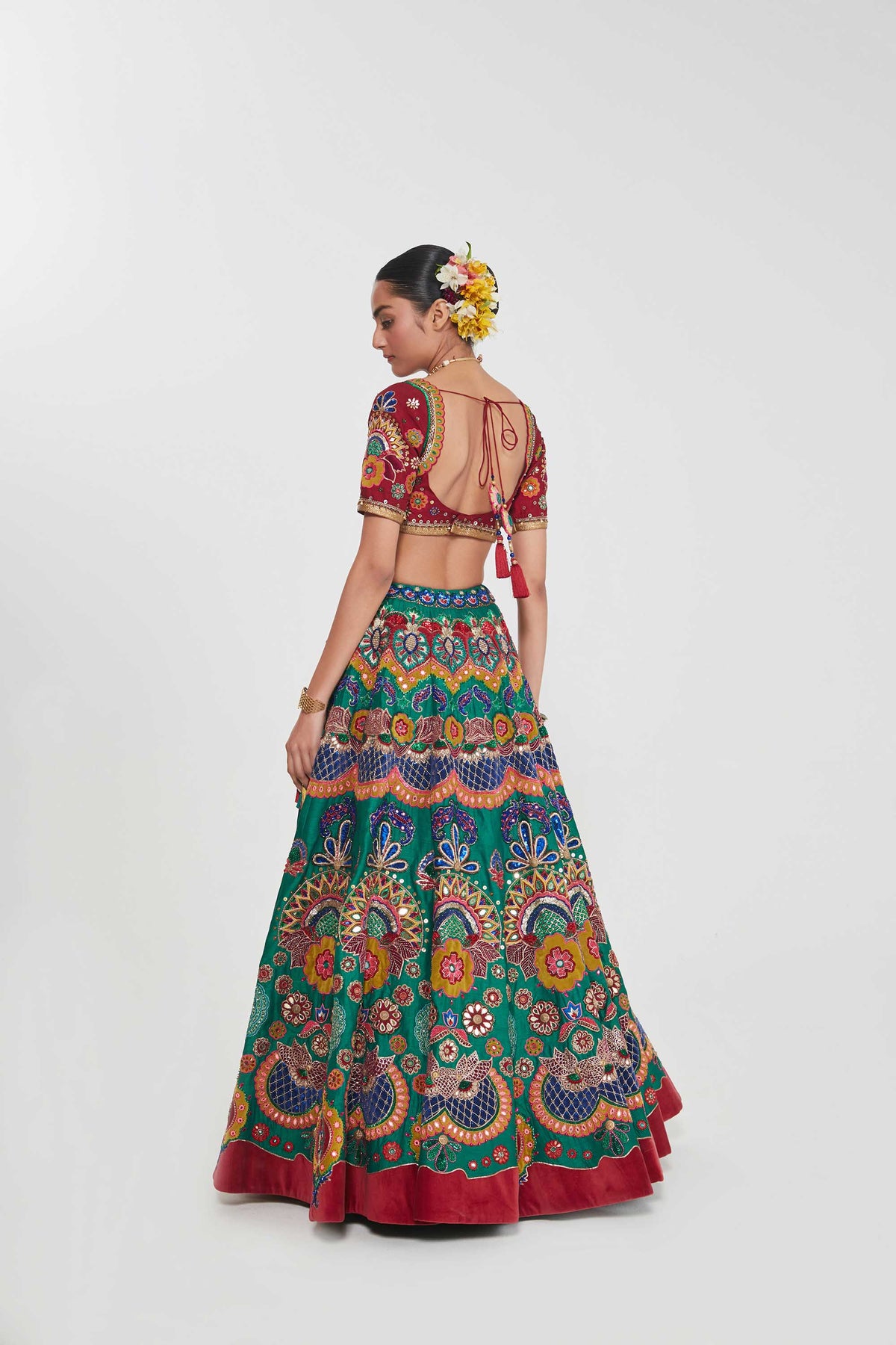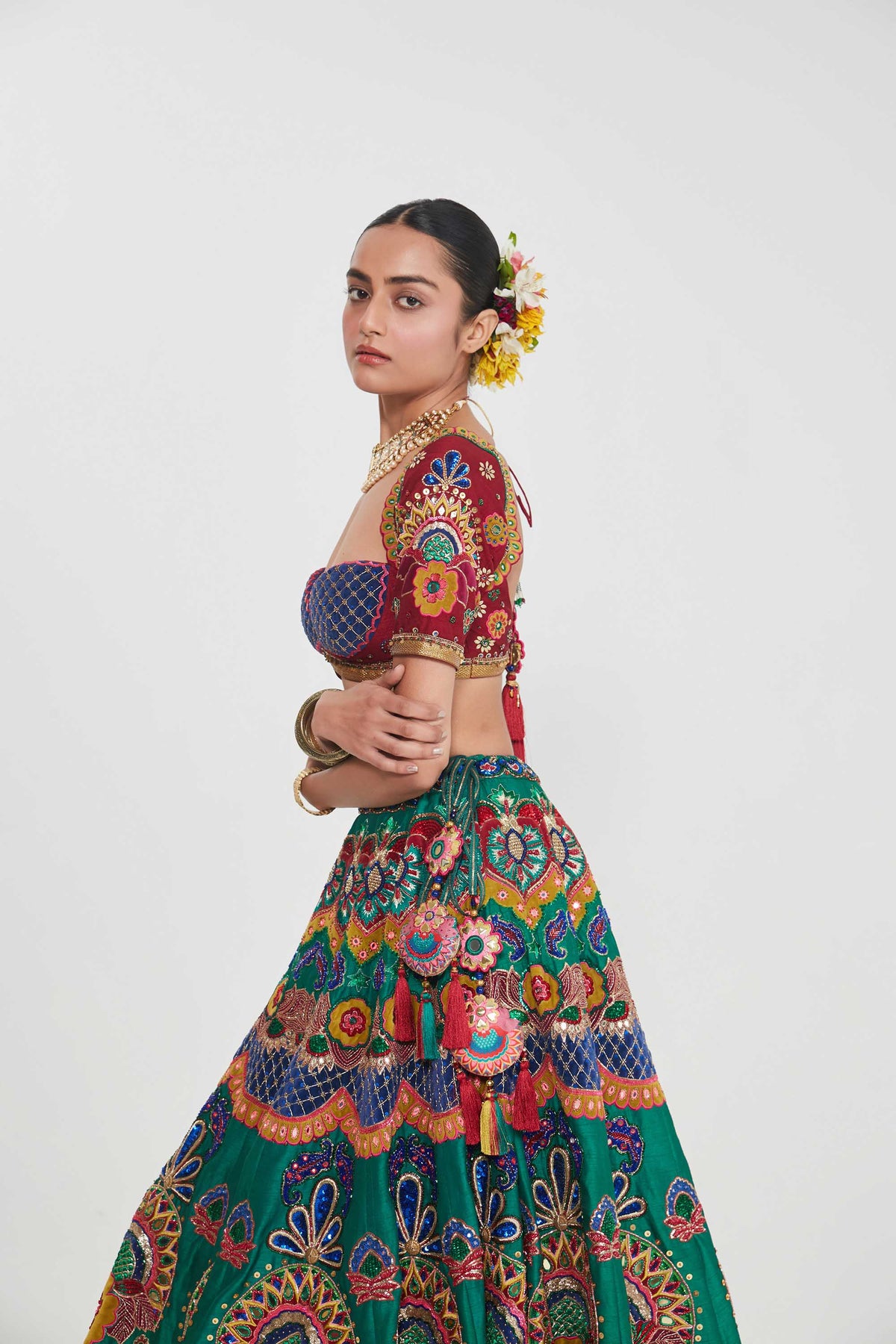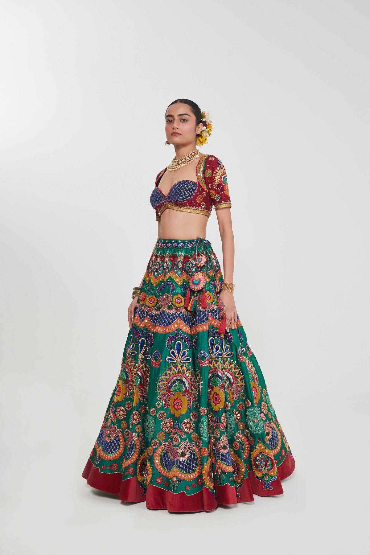 Teal And Multicolor Silk Lehenga Set Featuring Intricate Patch Work, Sequin And Resham Embroidery In Bold Floral And Kaleidoscopic Patterns. Paired With A Hand-Embroidered Pink Blouse And A Navy Blue Dupatta Highlighted With Vibrant Prints And A Gold Border.