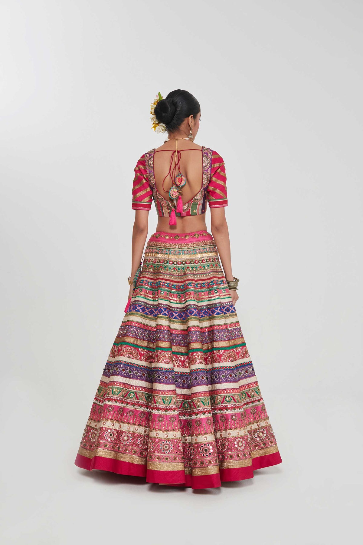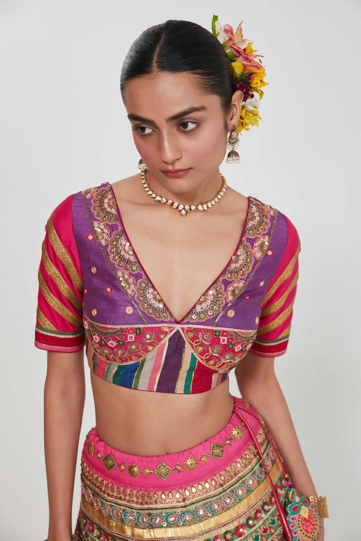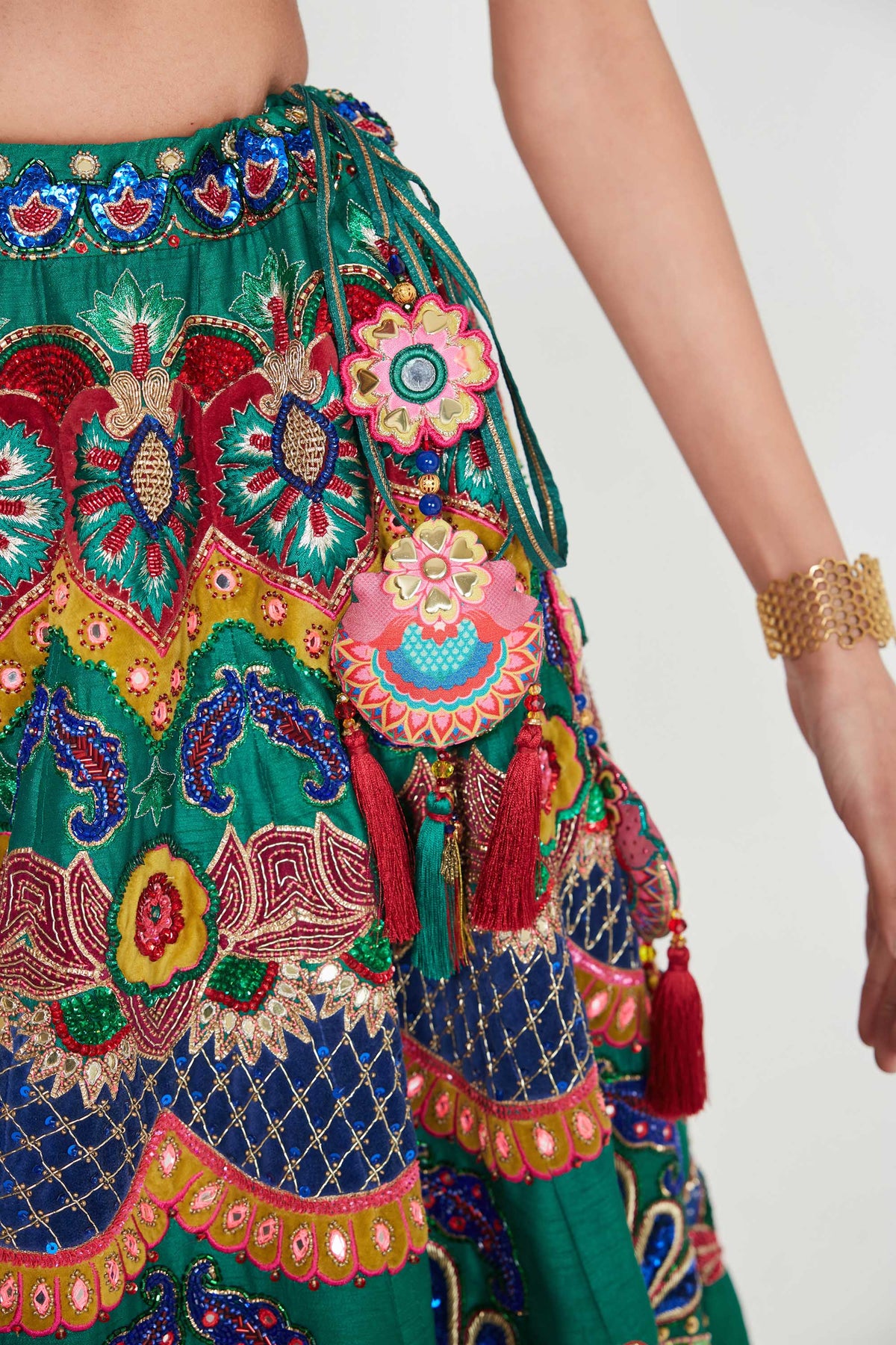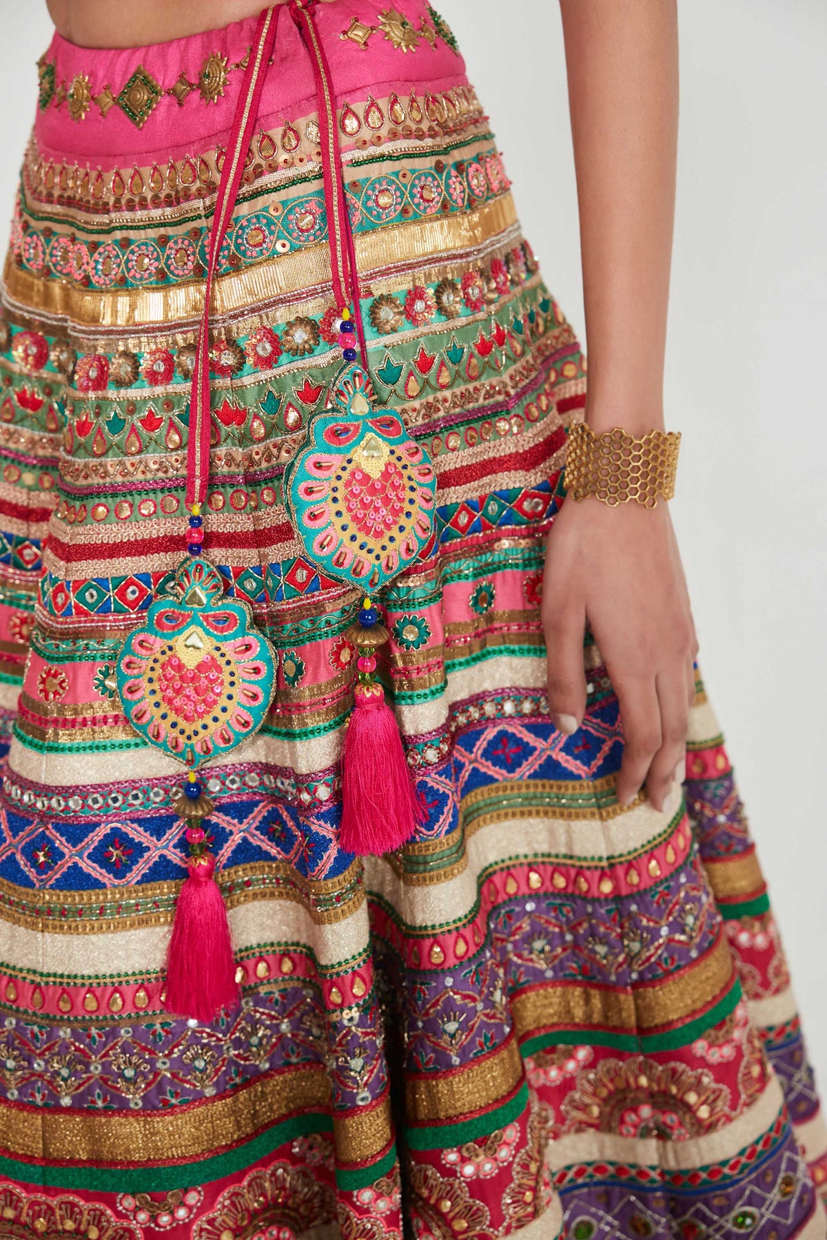 Teal And Multicolor Silk Lehenga Set Featuring Intricate Patch Work, Sequin And Resham Embroidery In Bold Floral And Kaleidoscopic Patterns. Paired With A Hand-Embroidered Pink Blouse And A Navy Blue Dupatta Highlighted With Vibrant Prints And A Gold Border.