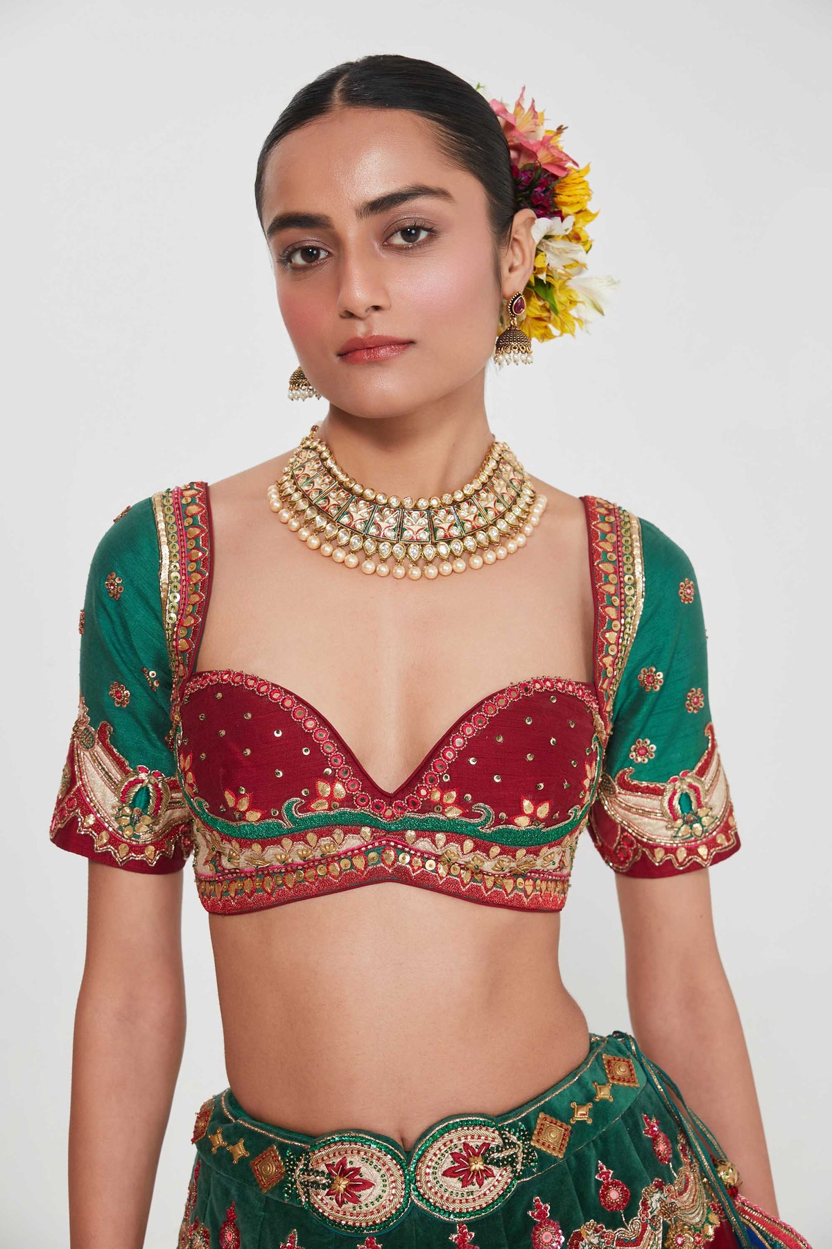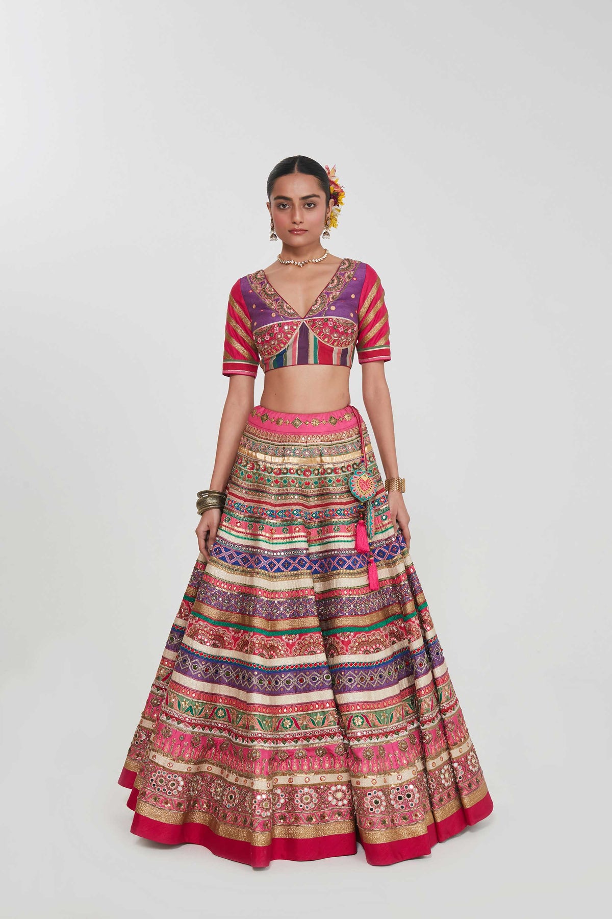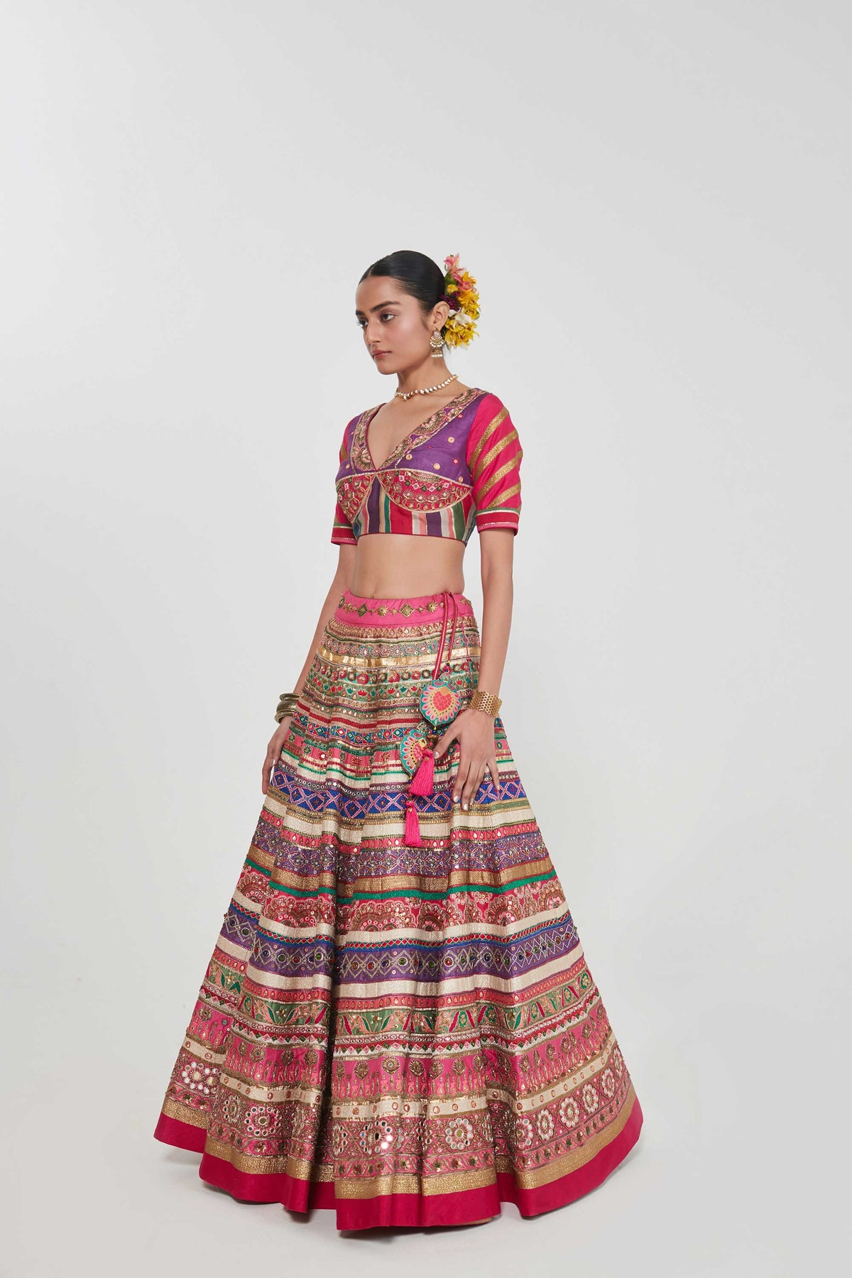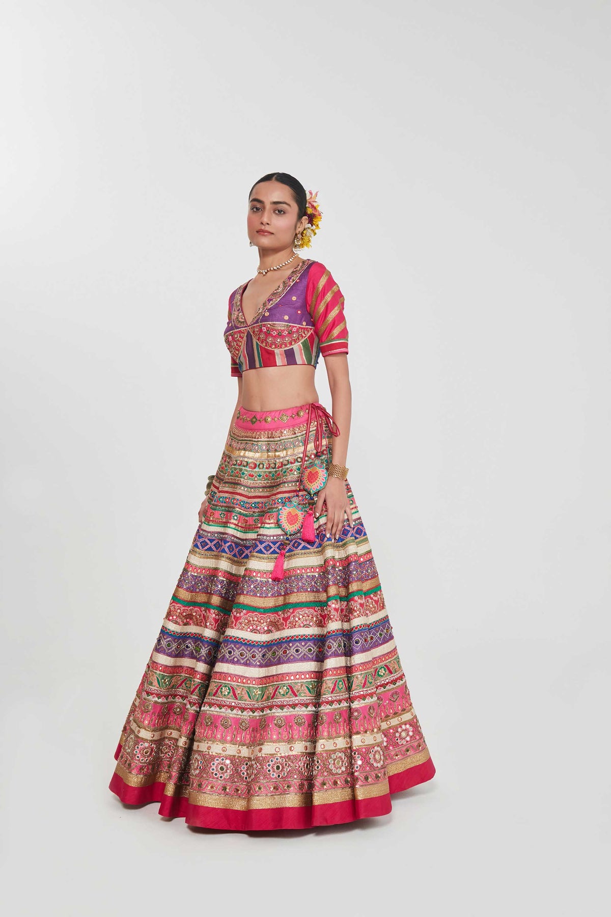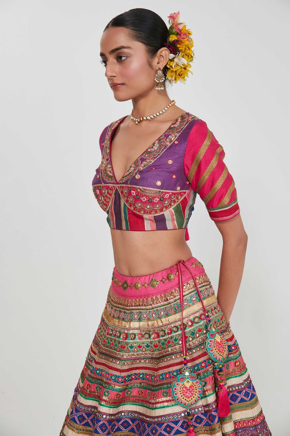 Teal And Multicolor Silk Lehenga Set Featuring Intricate Patch Work, Sequin And Resham Embroidery In Bold Floral And Kaleidoscopic Patterns. Paired With A Hand-Embroidered Pink Blouse And A Navy Blue Dupatta Highlighted With Vibrant Prints And A Gold Border.