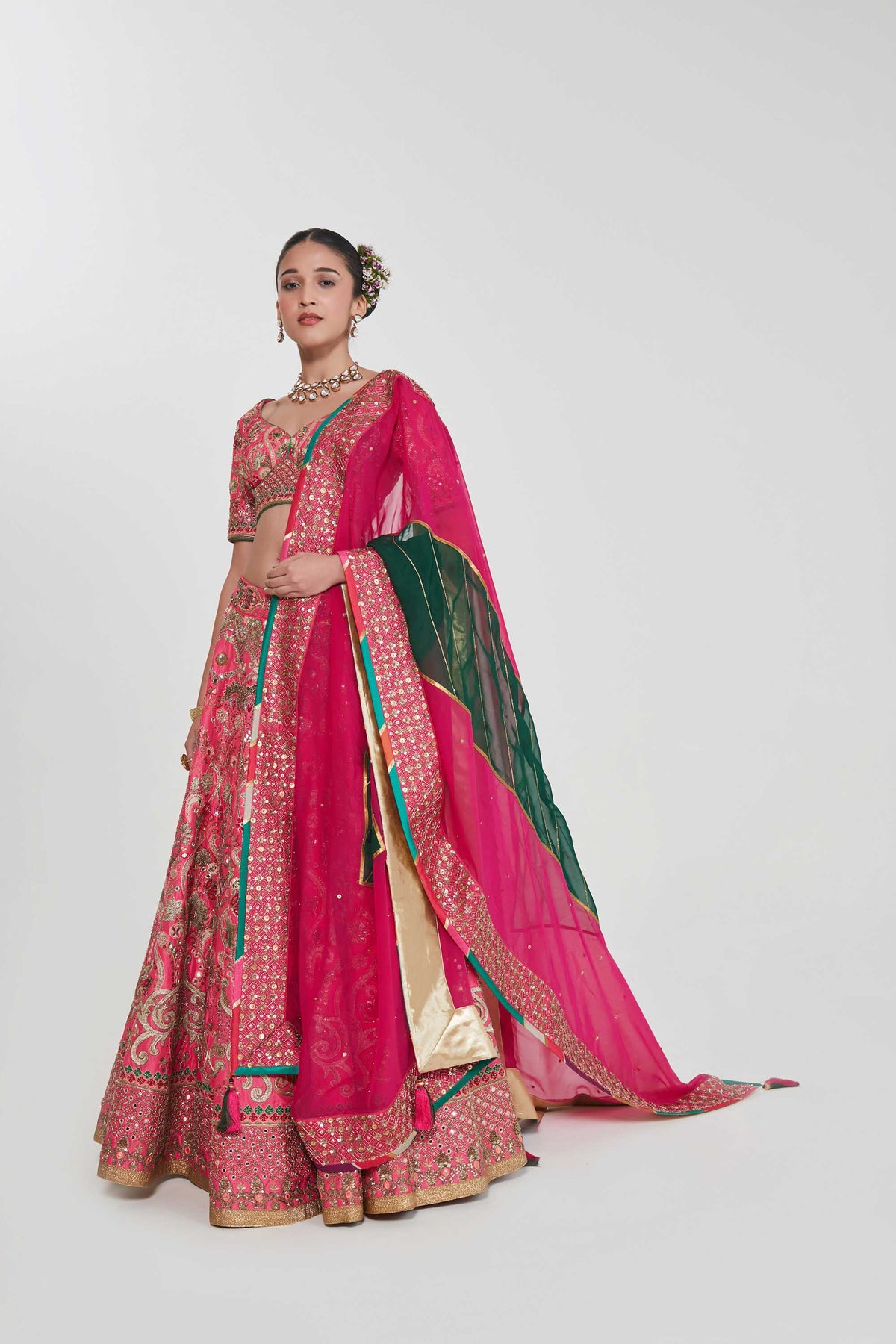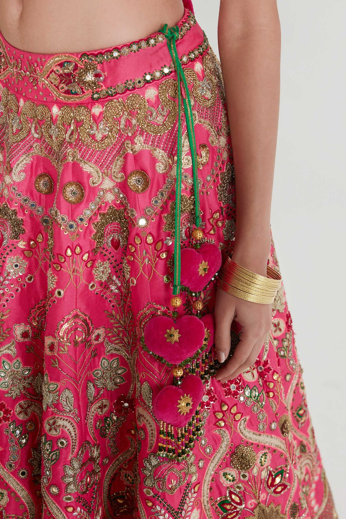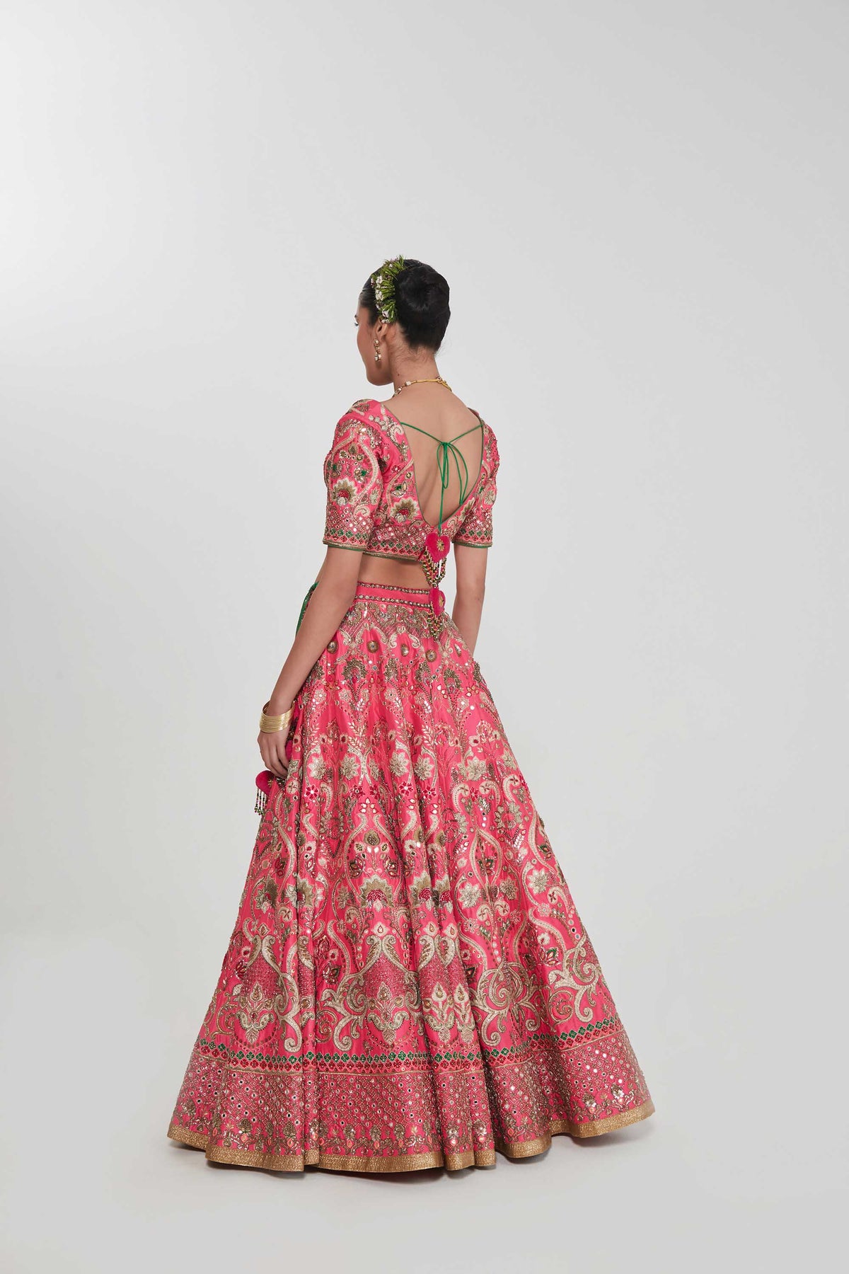Rani Pink Silk Lehenga Set Featuring Intricate Hand-Embellishment With Naqshi, Mirror And Resham Work. Paired With A Matching Embroidered Silk Blouse And An Organza Dupatta Finished With A Contrast Green Patchwork And Tassel Details.