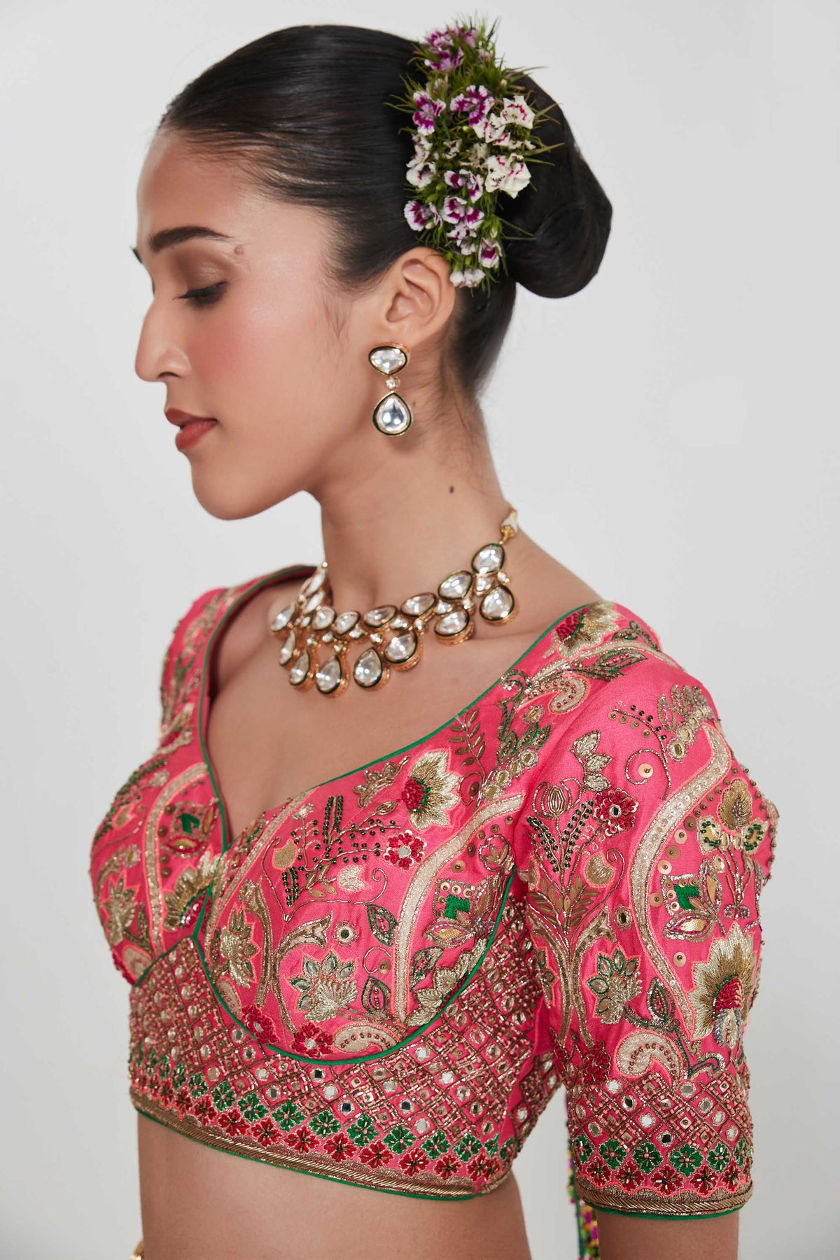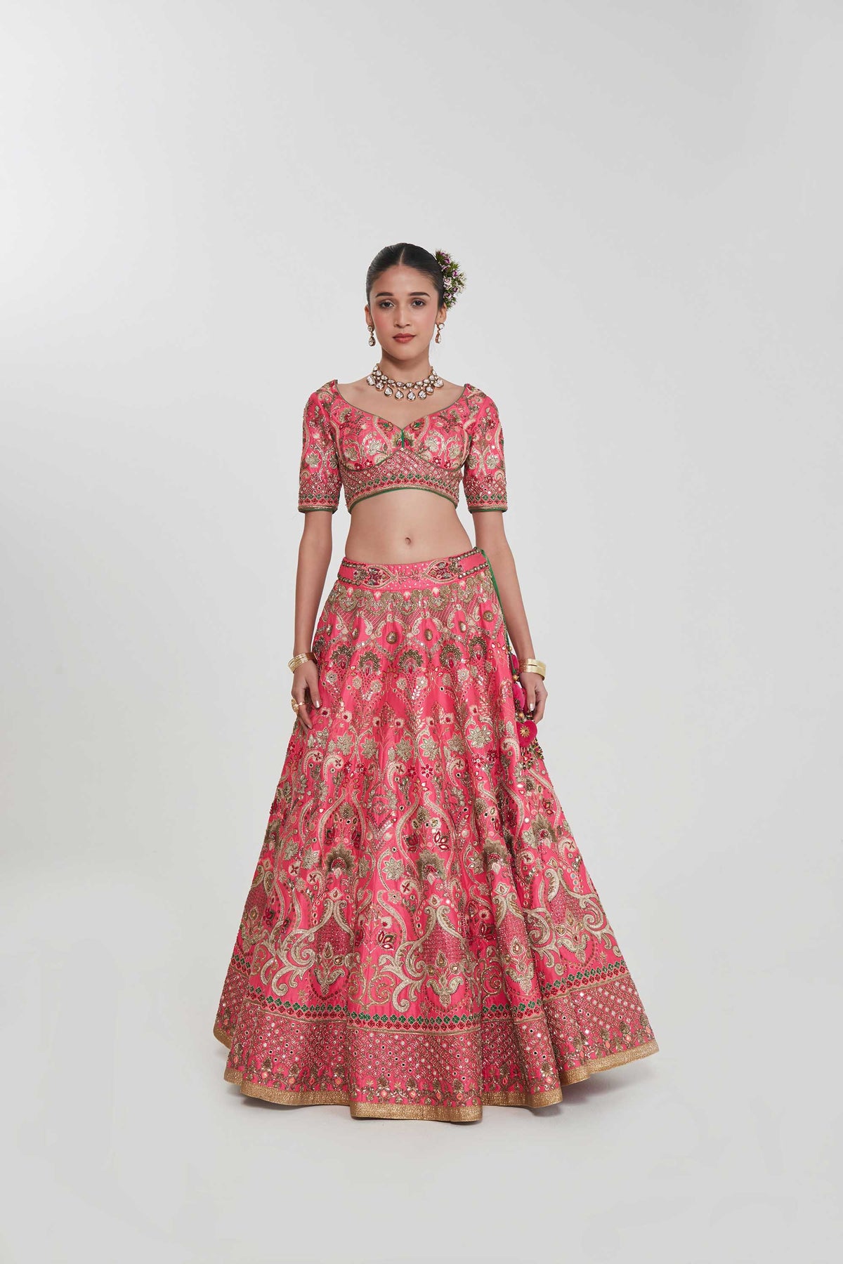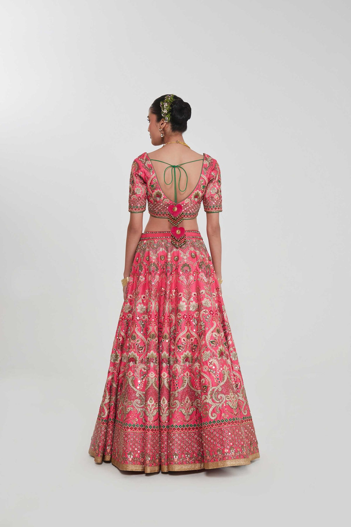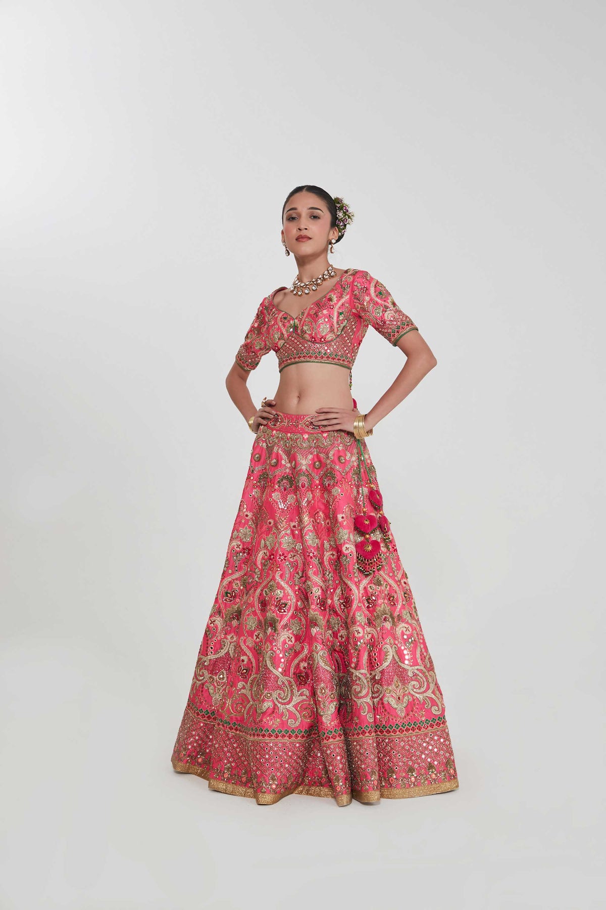 Rani Pink Silk Lehenga Set Featuring Intricate Hand-Embellishment With Naqshi, Mirror And Resham Work. Paired With A Matching Embroidered Silk Blouse And An Organza Dupatta Finished With A Contrast Green Patchwork And Tassel Details.
