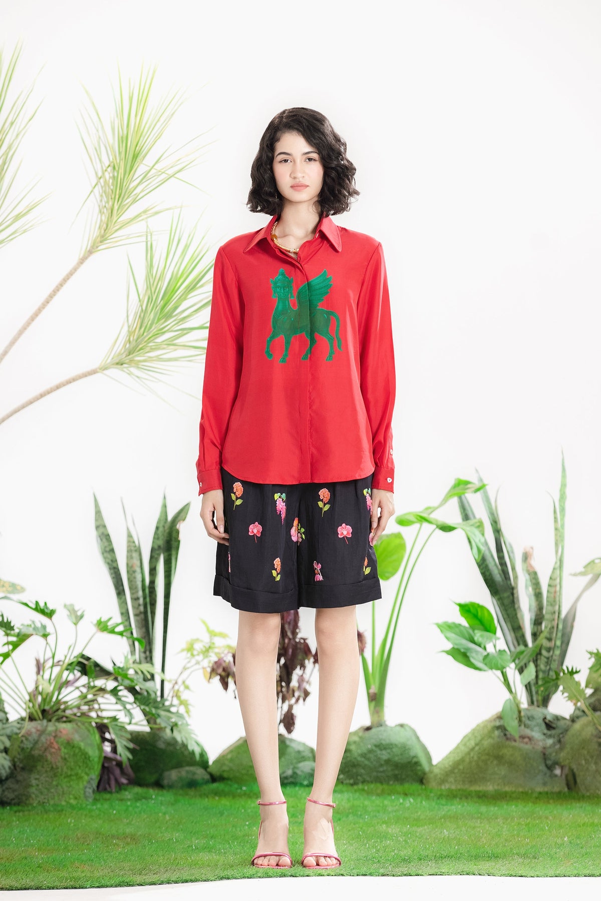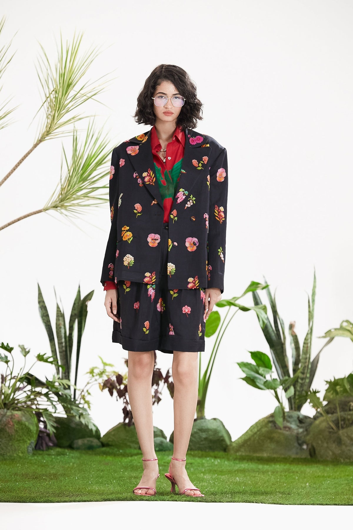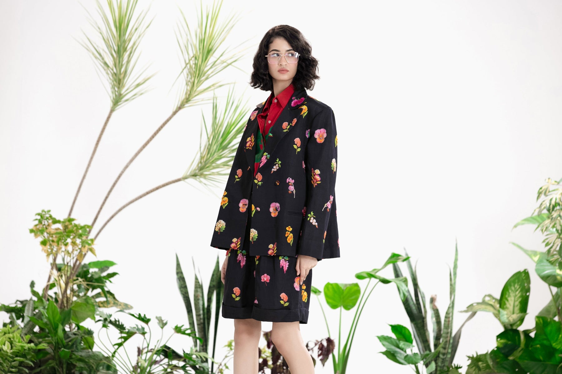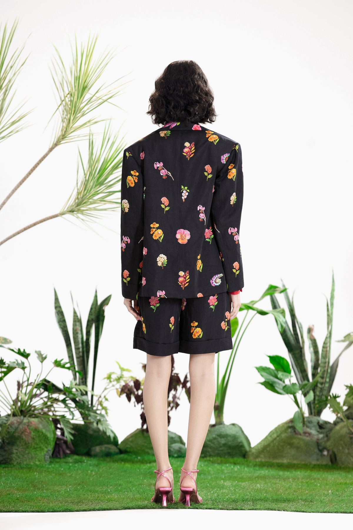 Elevate Your Wardrobe With This Statement Ensemble Featuring An Oversized Black Blazer Paired With Matching Satin-Linen Shorts. The Set Is Adorned With Bold Prints And Intricate Embroidery, Blending Contemporary Tailoring With Artisanal Detailing For A Striking, Fashion-Forward Look. Layered Underneath, A Playful Cow-Print Poplin Shirt Adds Contrast And Personality, Making The Outfit Perfect For Stylish Streetwear, Casual Events, Or Standout Occasions. A Versatile, Eye-Catching Set That Balances Structure, Artistry, And Playful Charm.
