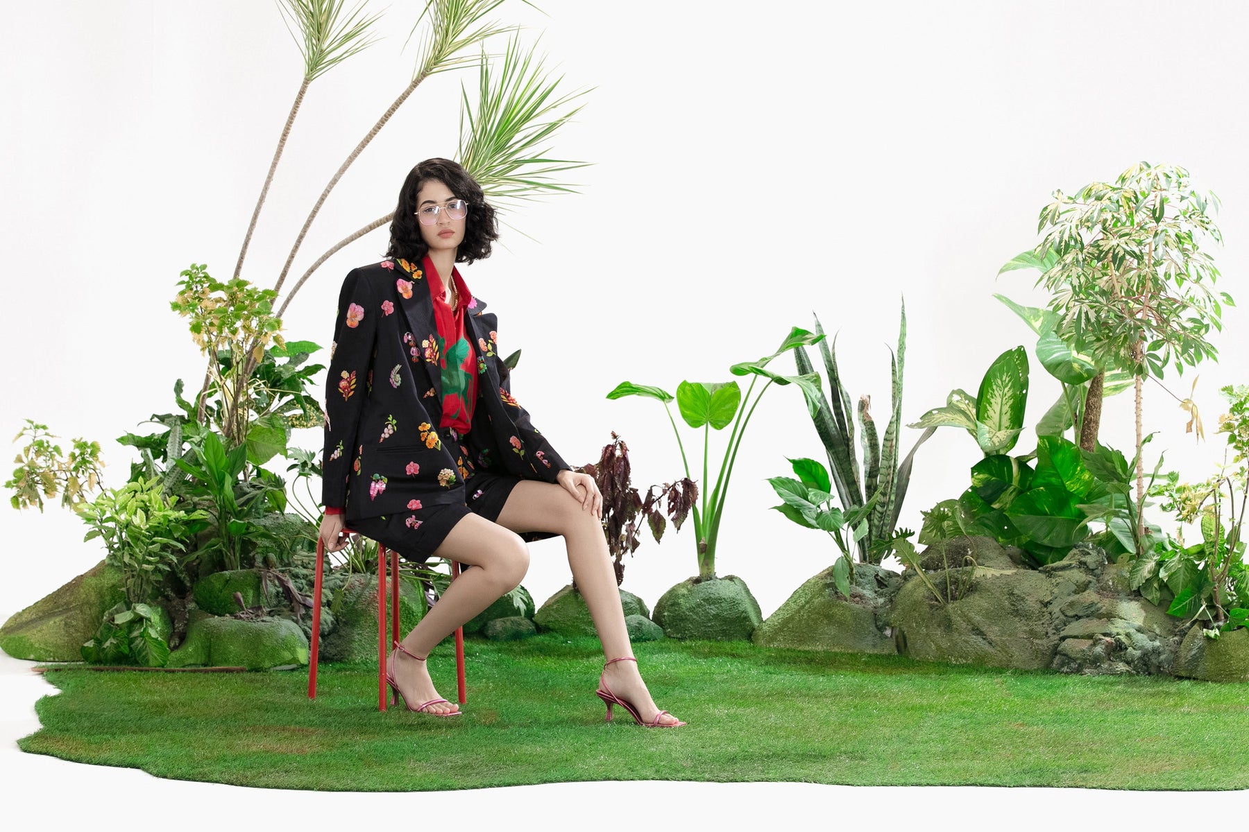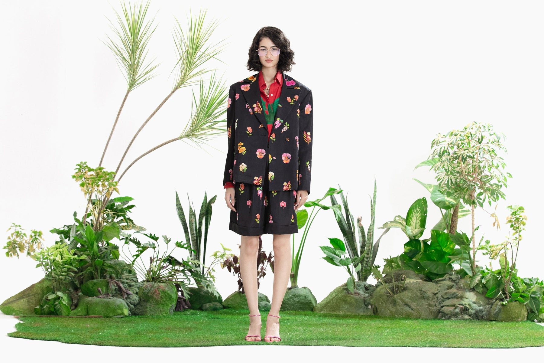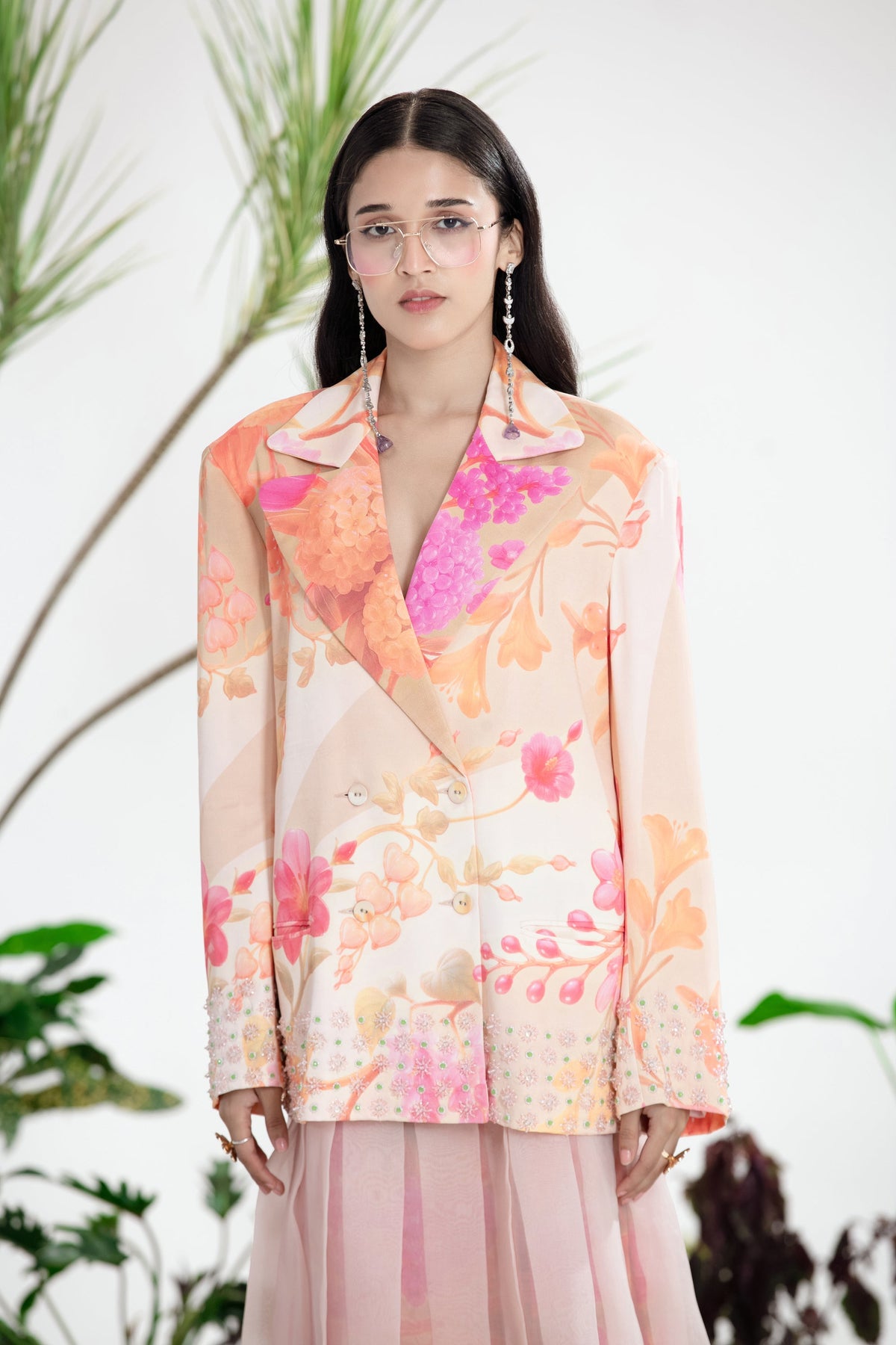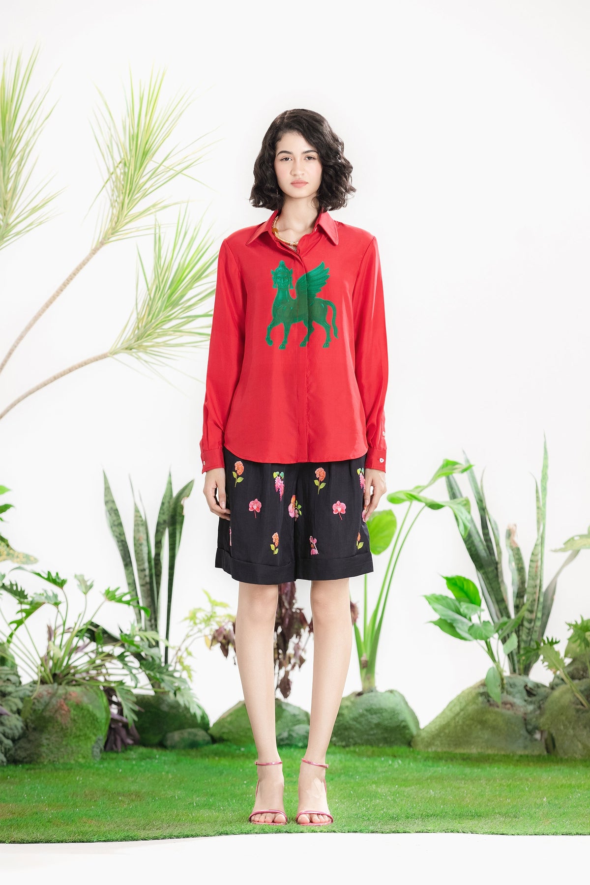 Elevate Your Wardrobe With This Statement Ensemble Featuring An Oversized Black Blazer Paired With Matching Satin-Linen Shorts. The Set Is Adorned With Bold Prints And Intricate Embroidery, Blending Contemporary Tailoring With Artisanal Detailing For A Striking, Fashion-Forward Look. Layered Underneath, A Playful Cow-Print Poplin Shirt Adds Contrast And Personality, Making The Outfit Perfect For Stylish Streetwear, Casual Events, Or Standout Occasions. A Versatile, Eye-Catching Set That Balances Structure, Artistry, And Playful Charm.
