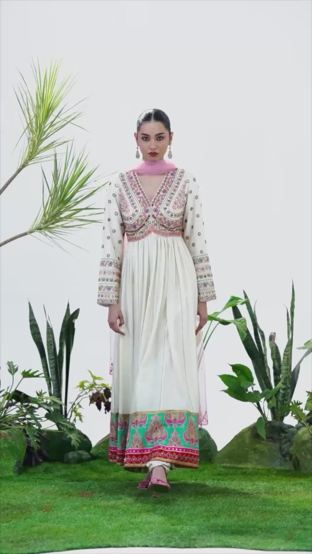 A ivory gathered anarkali with intricate multicolour embroidery on the bodice and cuffs, finished with a teal and pink paisley hem border. Styled with a sheer embroidered dupatta and a solid churidaar. Ideal for festive pujas, and intimate wedding events.