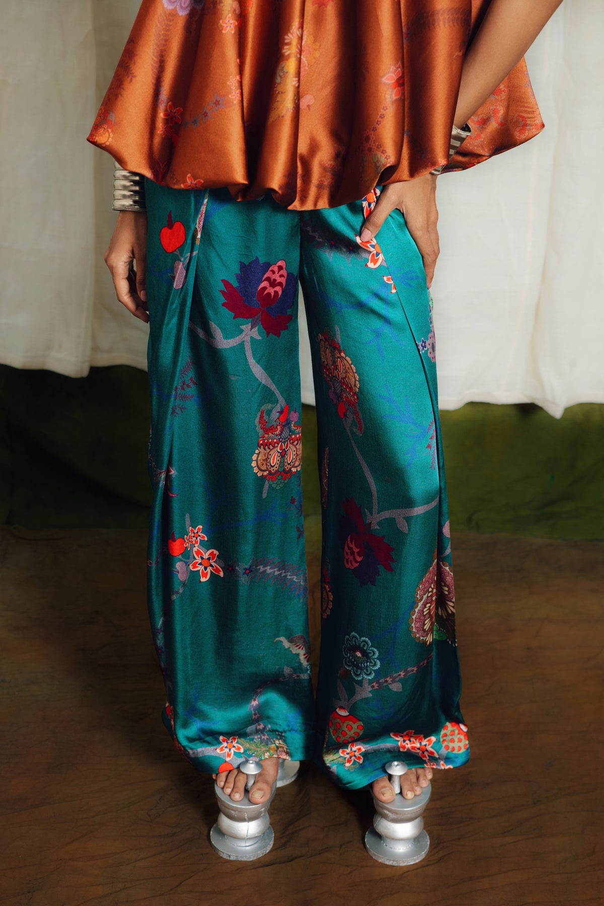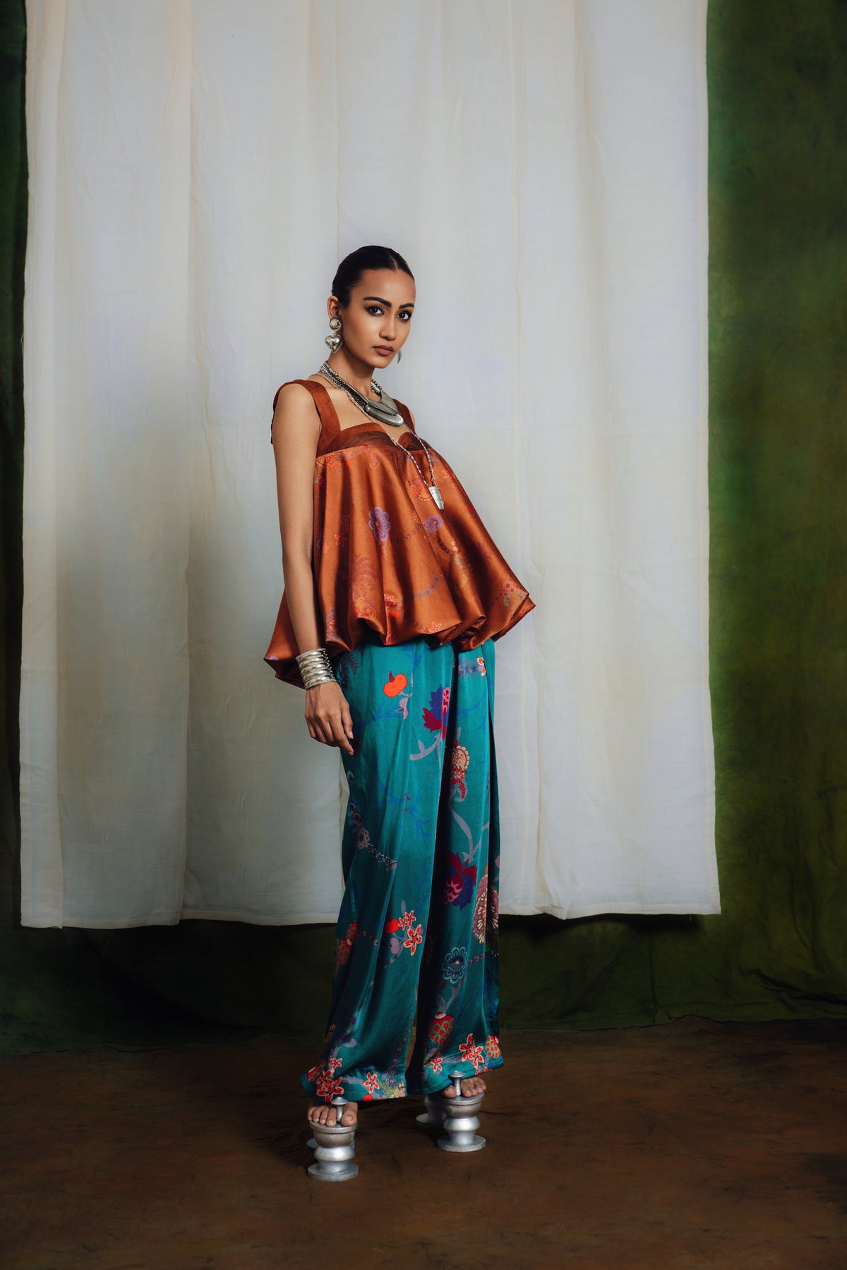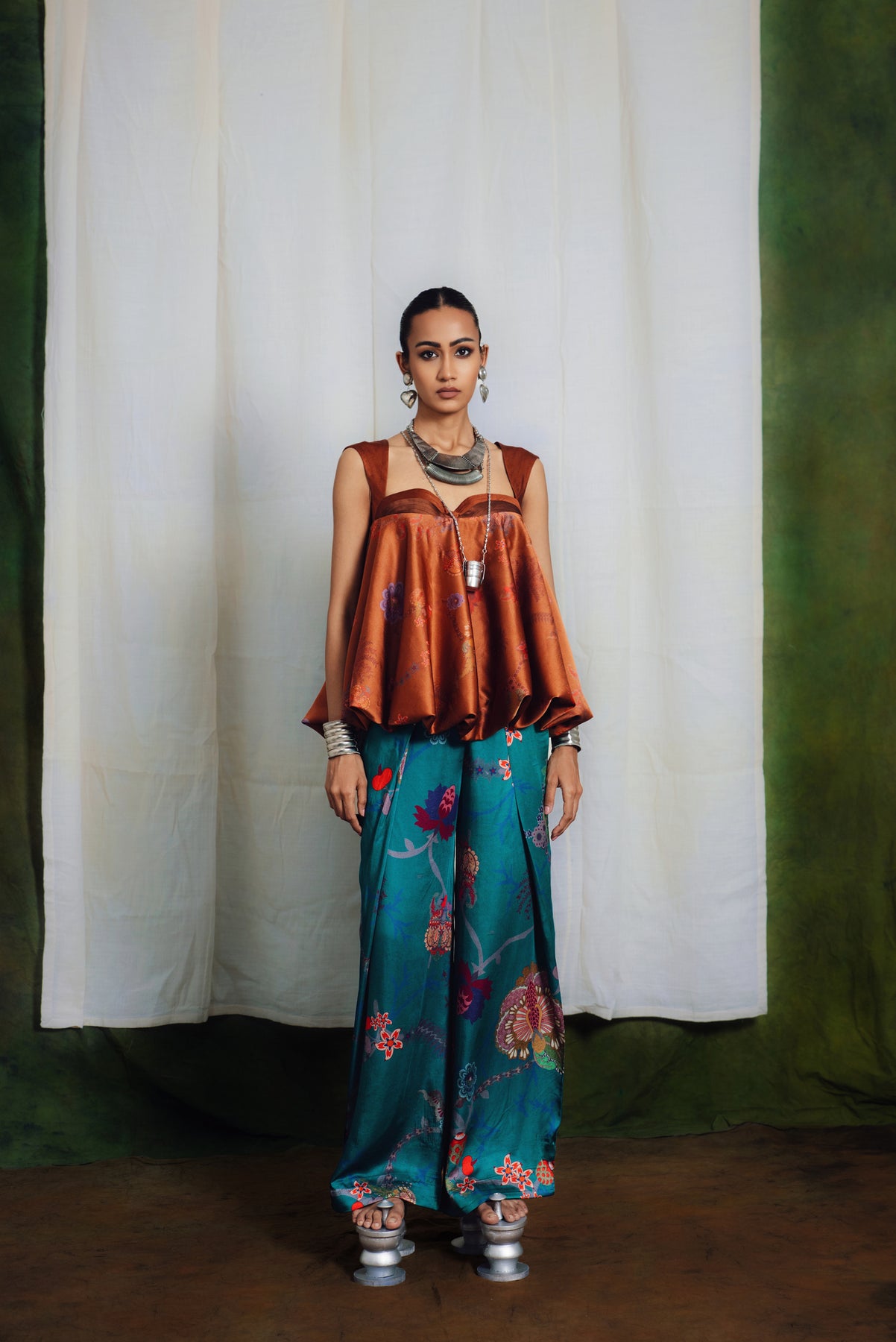Chintz Drenched Bubble Pleated Bustier Top That Draws Inspiration From The Silhouettes Of Rural Indian Streets, Paired With Contrasting Front Pleated Pants.
