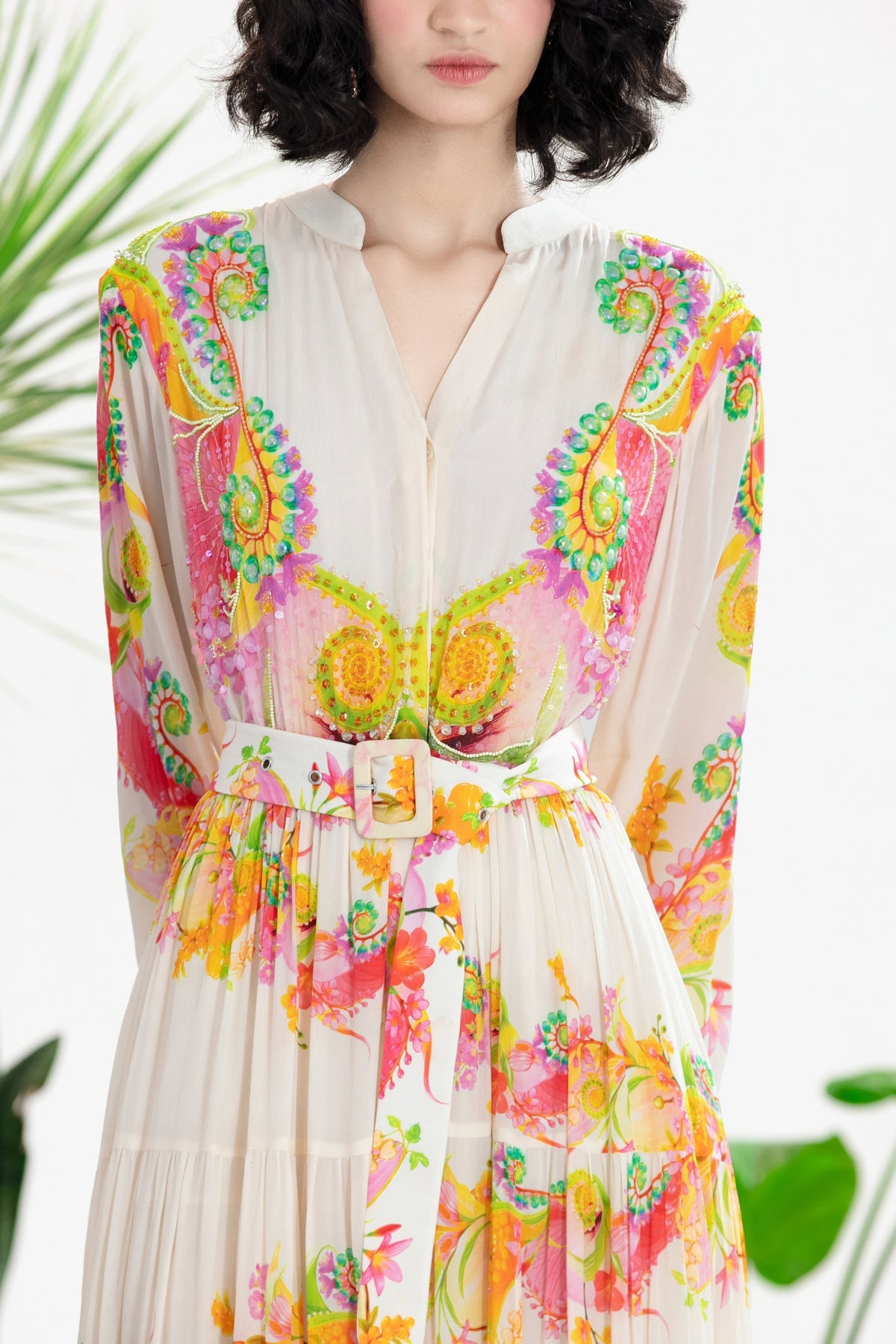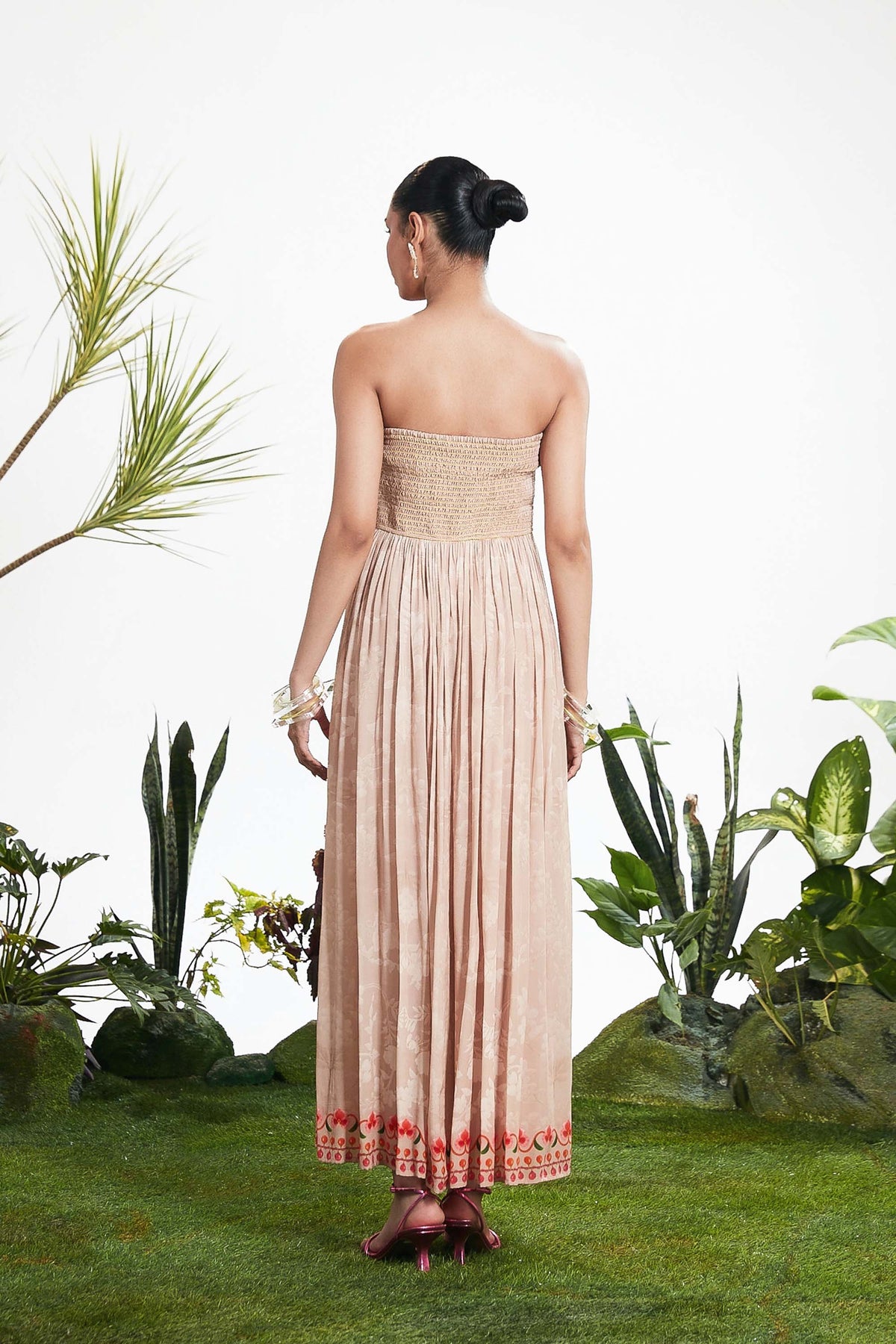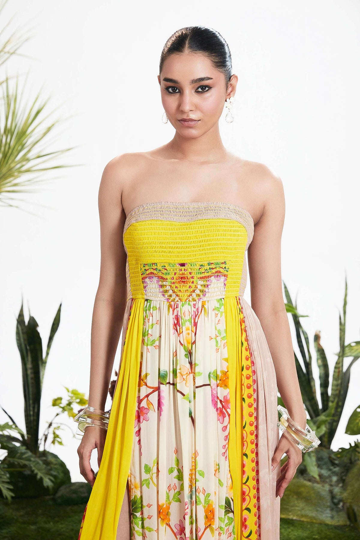 Elevate Your Style With This Feminine Strapless Empire-Line Dress Featuring Siddhartha Bansals Signature Print Style. Designed With Delicate Ruching On The Body, Tassel Strings At The Rear, And An Elasticated Back Panel For Comfort And Flexibility, This Printed Strapless Dress Is Perfect For Brunches, Daytime Parties, Casual Gatherings, And Stylish Everyday Wear. It Effortlessly Blends Playful Charm With Modern Sophistication.